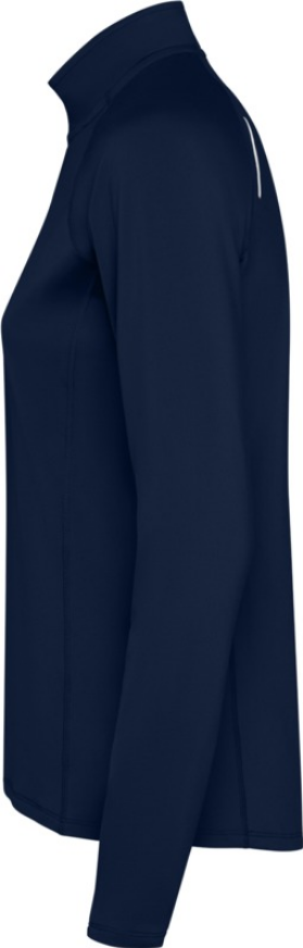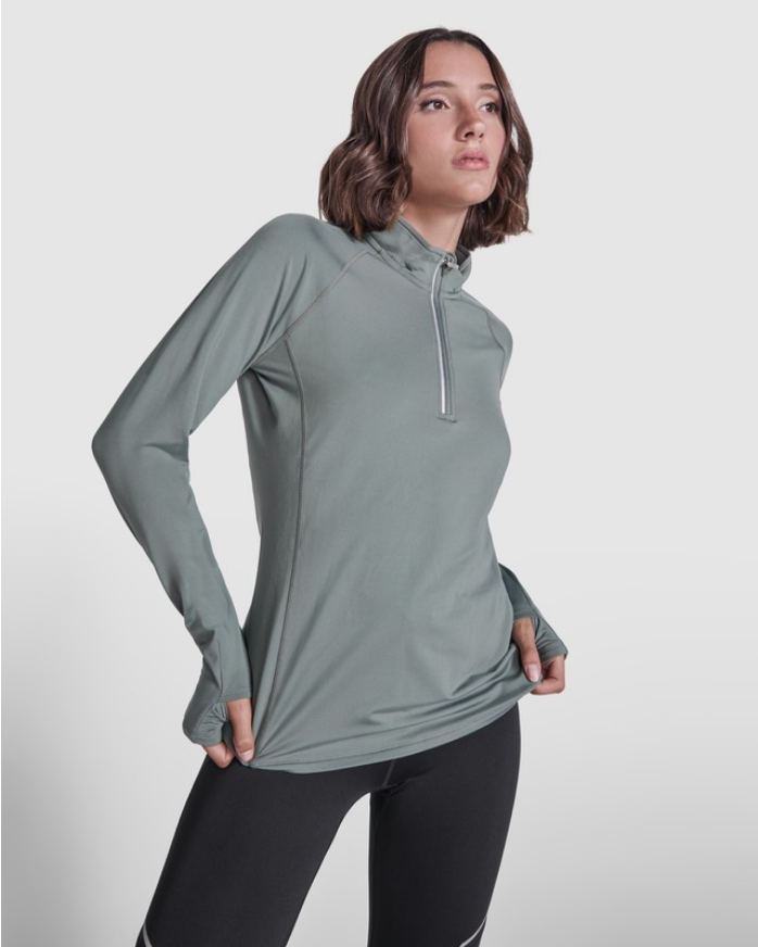 Dámská raglánová mikina s dlouhým rukávem. Slim-fit. Límec s obráceným designem na poloviční zip s reflexními detaily. Zesílené kryty švů. Manžety s otvory na palce. Reflexní detaily na zadní straně. Zadní lem je o něco delší než přední. Teplá kartáčovaná vnitřní tkanina.