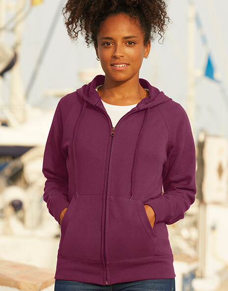 ·240 g/m2 ·80% bavlna, 20% polyester ·tenký nečesaný fleece ·kapucňa s plochou šnúrkou v rovnakej farbe ·raglanové rukávy ·prekytie zipsu pre jednoduchšiu potlač ·dve predné vrecká ·pás a manžety z bavlny/Lycra s rebrovaním