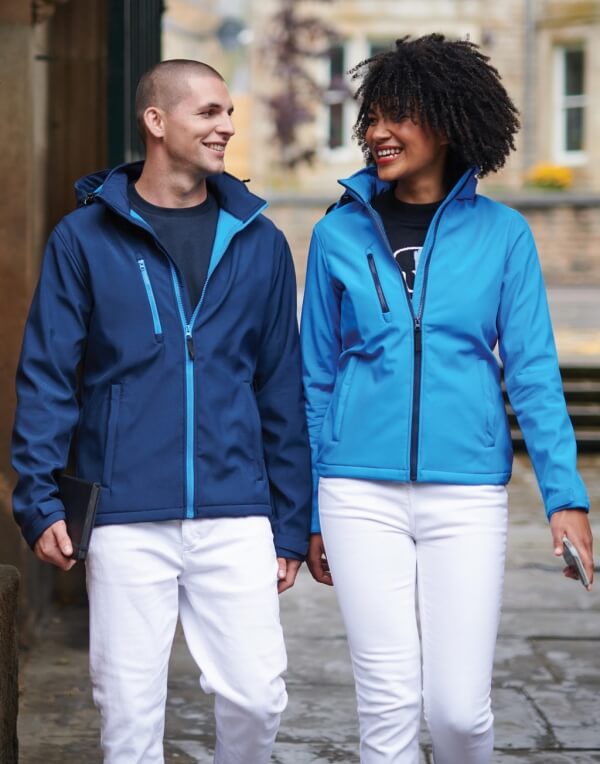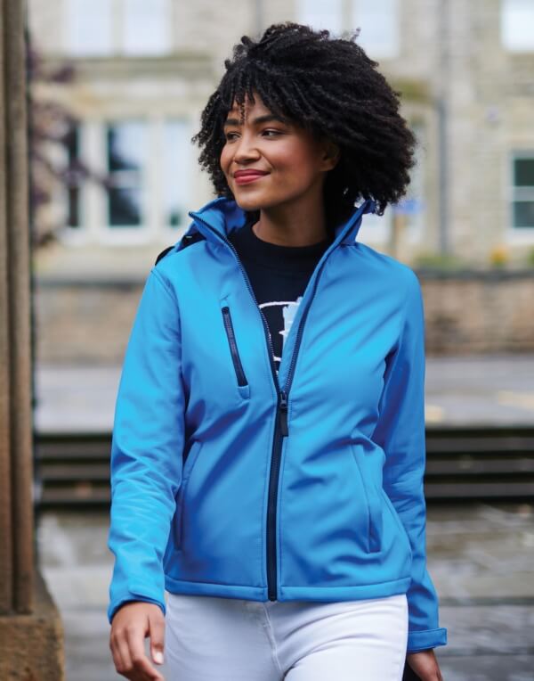 Dámska softshellová bunda s kapucňou Venture, gramáž: 300 g / m², vyrobená zo 100% polyesteru, tkaná softshellová nepremokavá a priedušná 3-vrstvová membránová tkanina, plne potlačiteľná vonkajšie látka, odolnosť proti vetru a vnútorná membrána, 2 spodné vrecká na zips a 1 náprsné vrecko na zips, odnímateľná softshellová kapucňa, nastaviteľná šnúrka, nastaviteľné manžety, odtrhnuteľná štítok.
