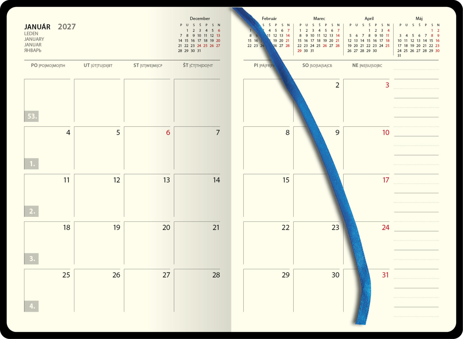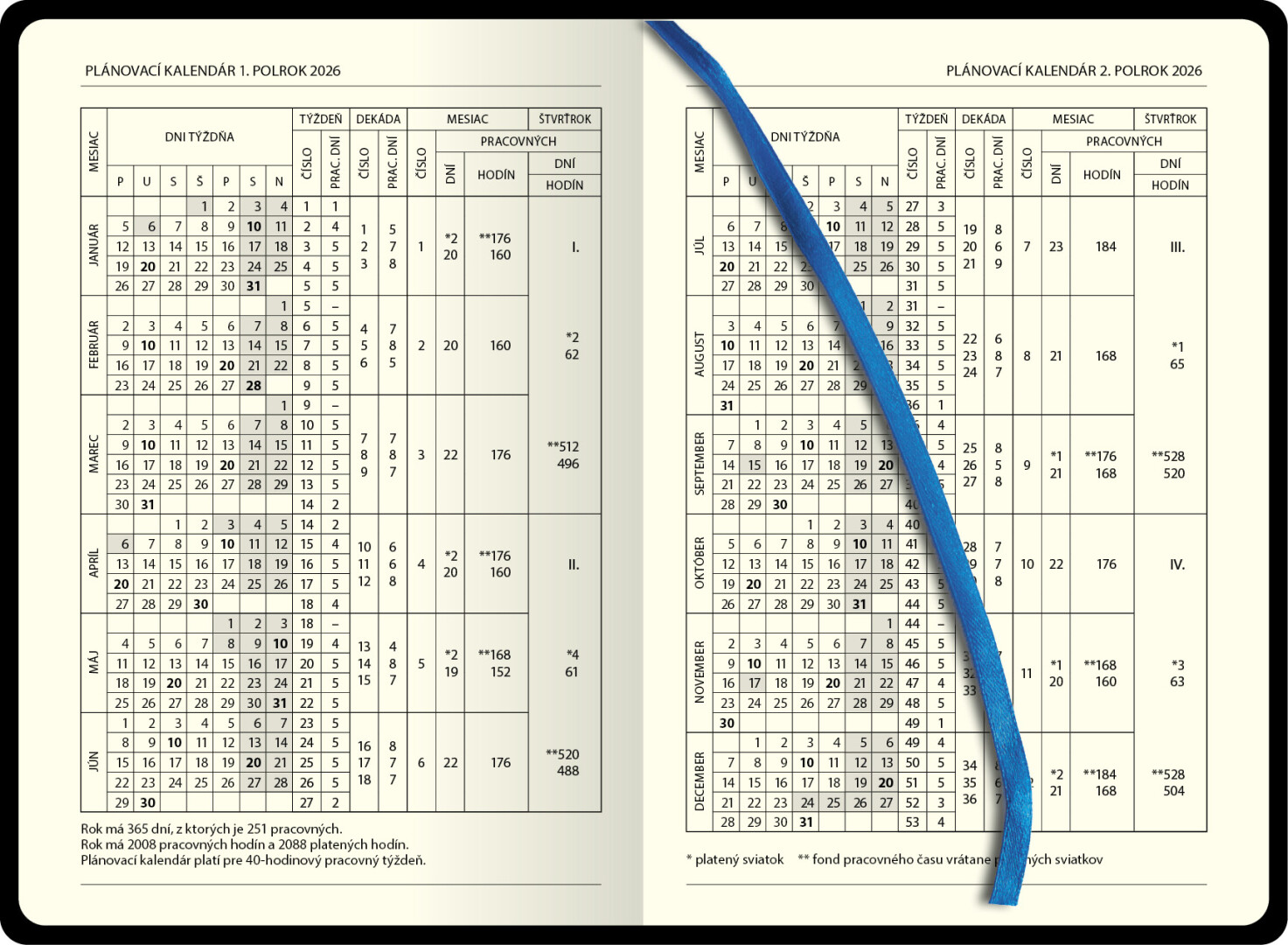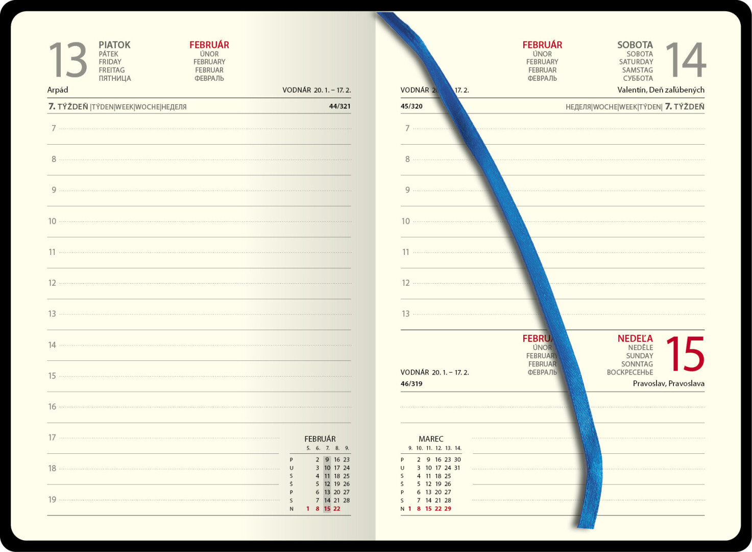 Denný diár s prehľadným kalendáriom na každý deň s pútkom a vloženým perom, gumičkou na uzatváranie a praktickým vreckom. Diár je v pevnej väzbe z ekologickej kože a s razbou roka. Obsahuje slovenské kalendárium.