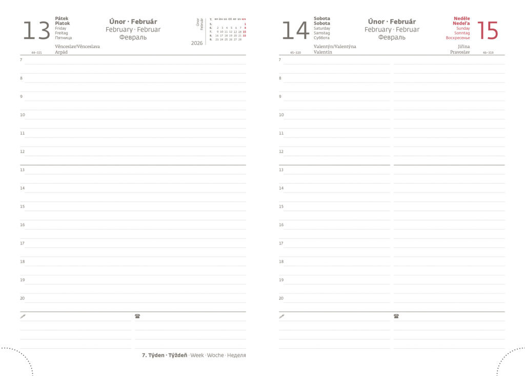 Diár obsahuje: osobné údaje, plánovač dovolenky (mesačný prehľad), plánovací kalendár, telefónne predvoľby, štátne sviatky Českej a Slovenskej republiky, medzinárodné sviatky, ročný výhľad, denný layout, adresár, mapa Európy a Českej a Slovenskej republiky