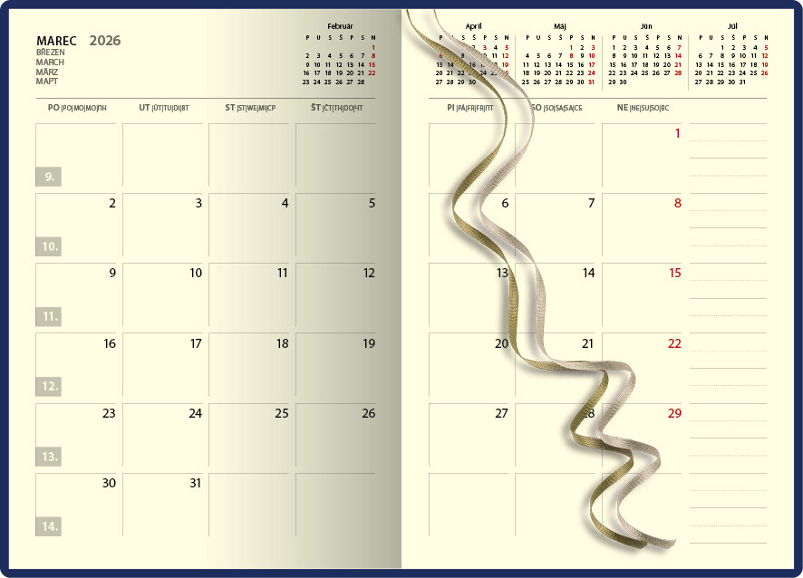 Obľúbený denný diár má oderuvzdorný povrch s motívom folklórnej stuhy. Efektná razba fóliou a 3D lak vytvárajú dokonalý dizajn. Jediný svojho druhu na trhu. Obsahuje slovenské kalendárium. Bočné plochy diára sú potlačené farebným motívom.