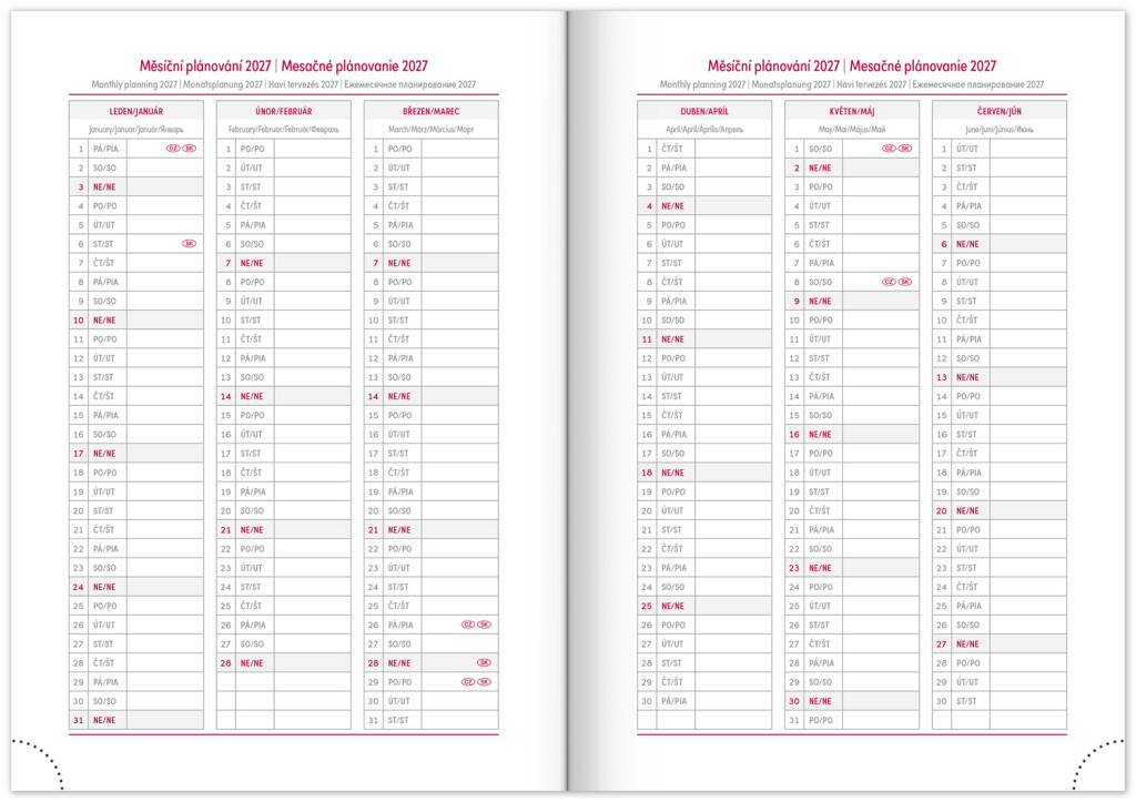 Denný diár Aprint Top 2026. Rozšírenie obľúbeného radu Aprint o variant s gumičkou na zatváranie a pútkom na ceruzku. Denný rozvrh s česko-slovenským kalendáriom a doplnkovou angličtinou, nemčinou, maďarčinou a ruštinou.