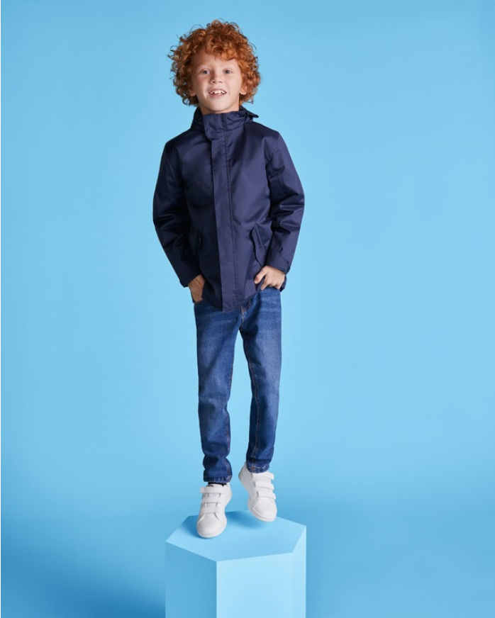 Nepremokavá zateplená parka pre deti. Vysoký golier a zapínanie na suchý zips. Praktická skladacia kapucňa. Centrálny zips ladiaci s chlopňou. Bočné vrecká so zipsom a pevnou chlopňou. Vnútorné vrecko so zapínaním na suchý zips. Nastaviteľné manžety s pútkom na opasok. Možnosť prístupu k výstuhám na chrbte a ľavej časti hrude.