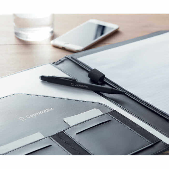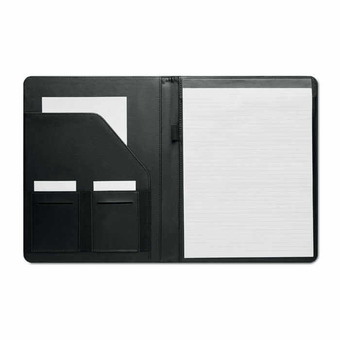 Elegantné portfólio o veľkosti A4 z dvojfarebného materiálu 300D RPET. Majte v týchto užitočných kancelárskych doskách usporiadanú všetku prácu. Má vnútorné priehradky a pútko na uloženie pera alebo ceruzky. Súčasťou je linajkový poznámkový blok na 20 listov. Obal je vyrobený z recyklovaného materiálu PET.