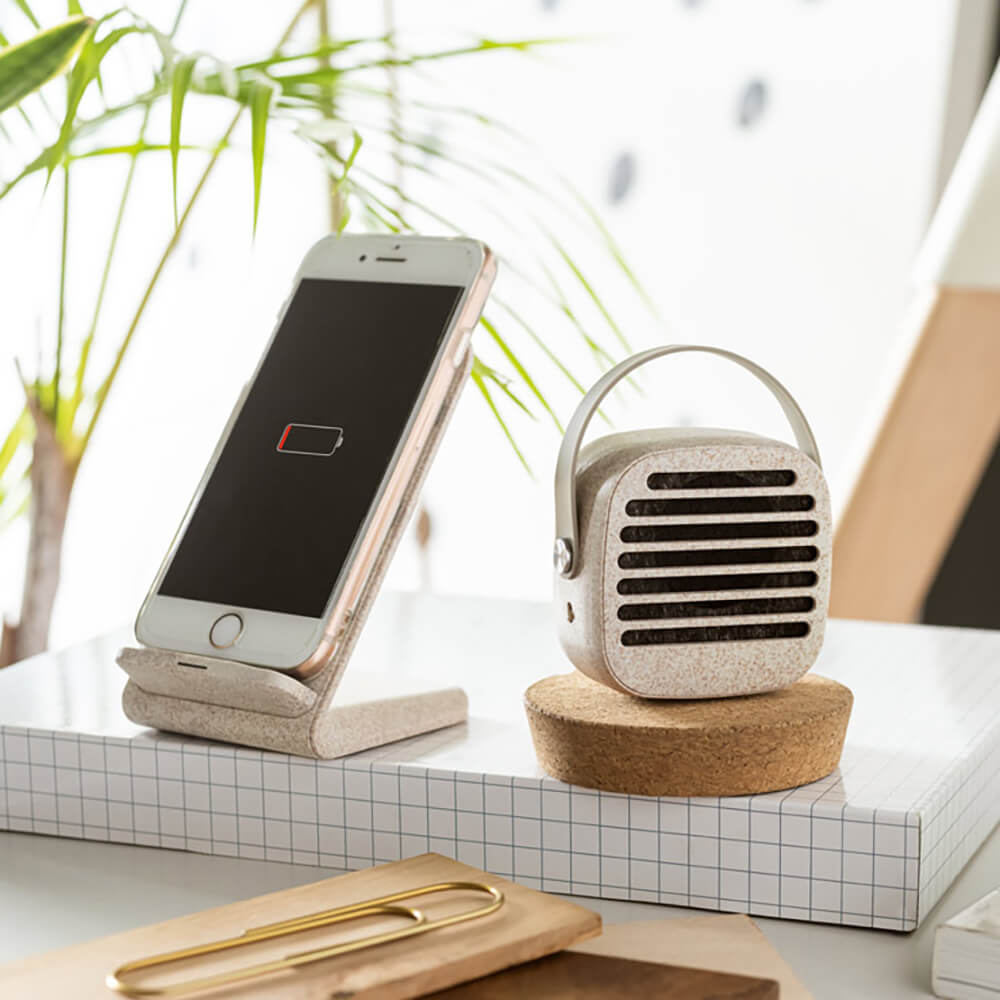 Pšeničné slamené vlákno a držiak mobilného telefónu ABS s bezdrôtovou nabíjačkou. S rýchlym nabíjacím výkonom 10 W a so vstupmi 5V/2A a 9V/1.67A. Obsahuje 1 m micro USB nabíjací kábel. Dodávané v papierovej škatuli zo sulfátu. 70 x 112 x 87 mm