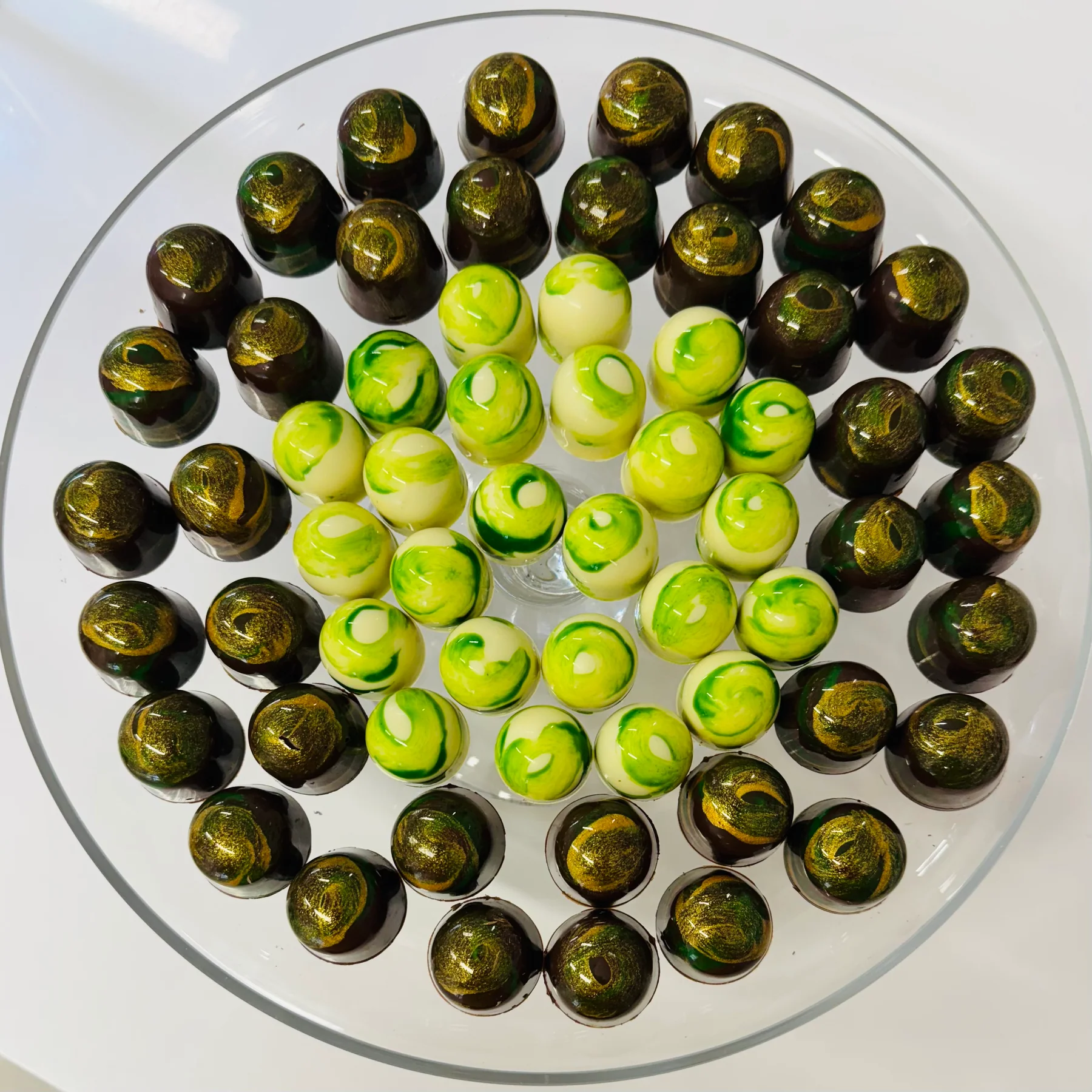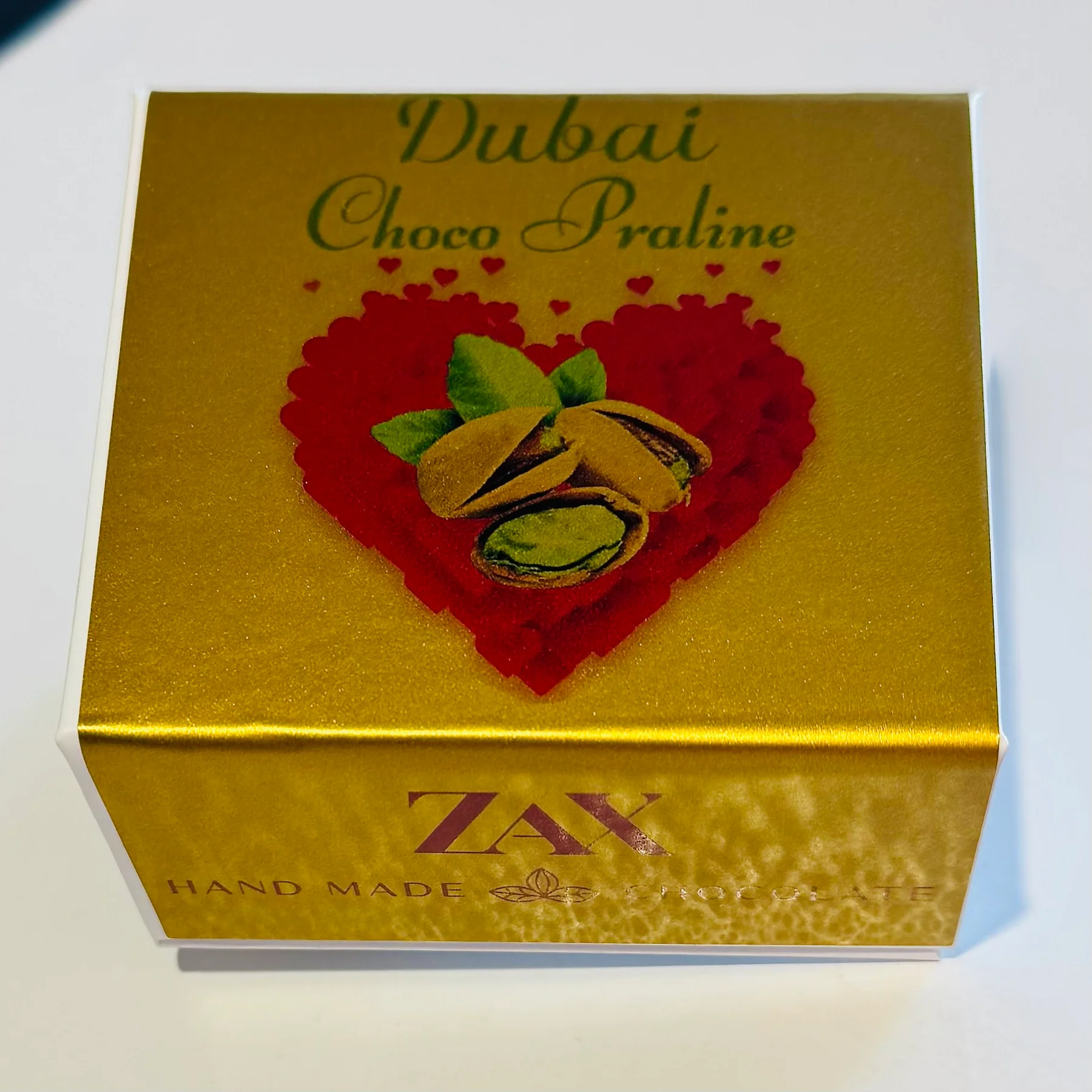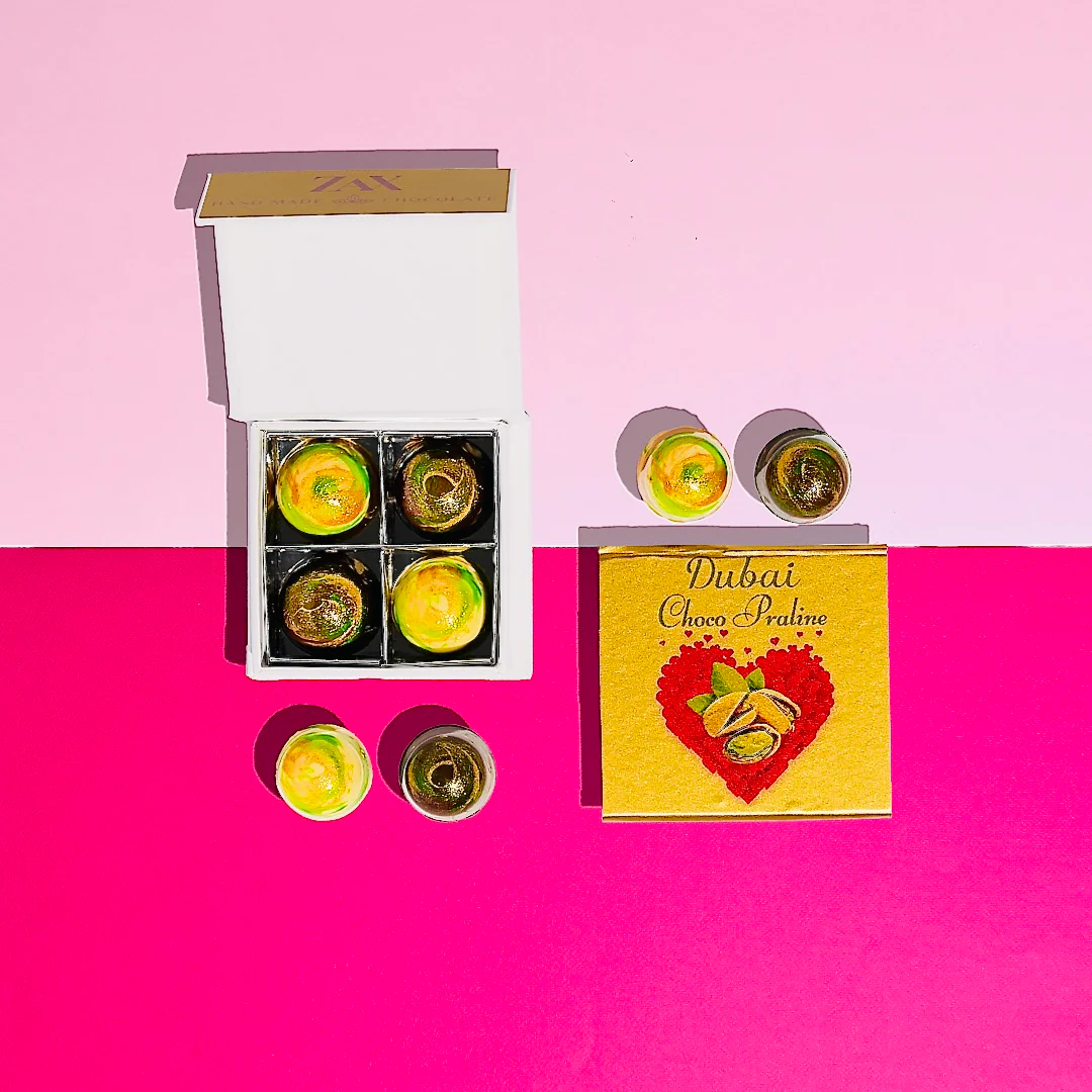 DUBAI Choco Praline je exkluzívna kolekcia 2+2 ručne maľovaných praliniek s 100 % pistáciovou pastou, tahini a jemným kadayifom, ktoré vytvárajú orientálnu harmóniu chutí. Prémiová biela a mliečna čokoláda, chrumkavá aj krémová textúra a luxusné balenie s magnetickým zatváraním spravia z tejto bonboniéry skutočný zážitok. Doprajte si kúsok dubajského luxusu a podeľte sa o jedinečný okamih s partnerom. Trvanlivosť: 6 týždňov. Rozmer: 80 × 74 × 40 mm. Váha: 50 g