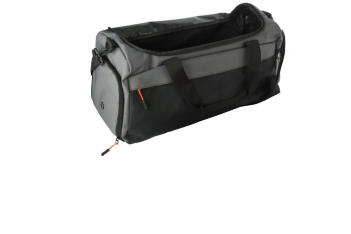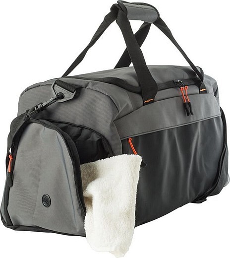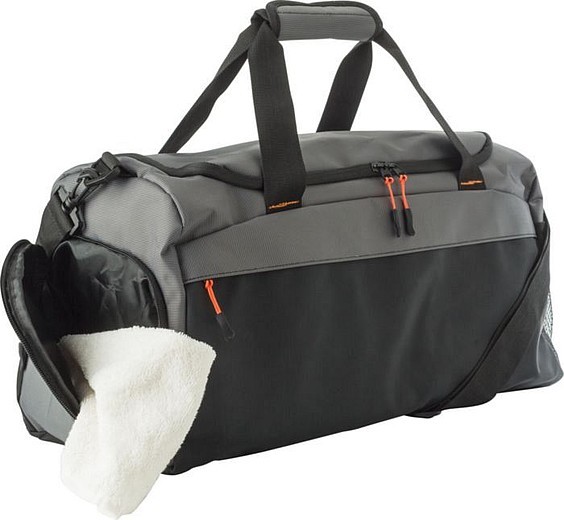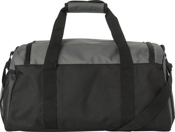 Dvojfarebná športová taška s predným vreckom na zips. Odvetrávaná bočná priehradka na obuv a sieťované vrecko na opačnej strane. Krátke rúčky so zapínaním na suchý zips. Veľké hlavné vrecko so zosilneným dnom. Rozmery: 50 x 24 x 26 cm