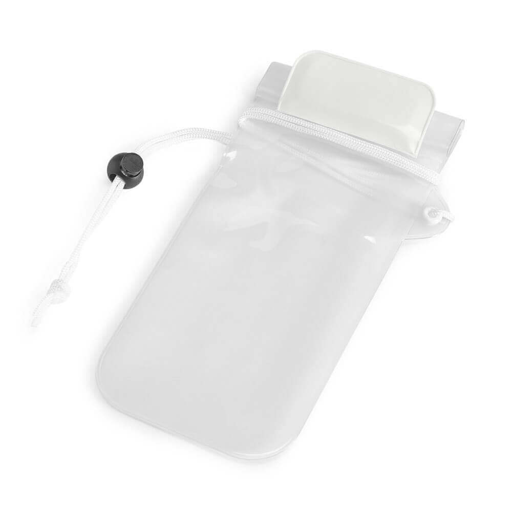 Vodotesné puzdro na mobilný telefón z PVC s nastaviteľným pružným popruhom. Predná časť je priehľadná a zadná strana matná biela. Puzdro má vzduchotesný uzáver a farebnú chlopeň so suchým zipsom. 240 x 95 mm