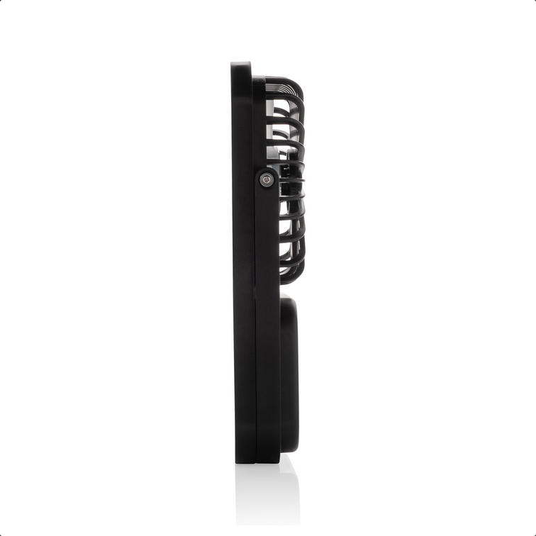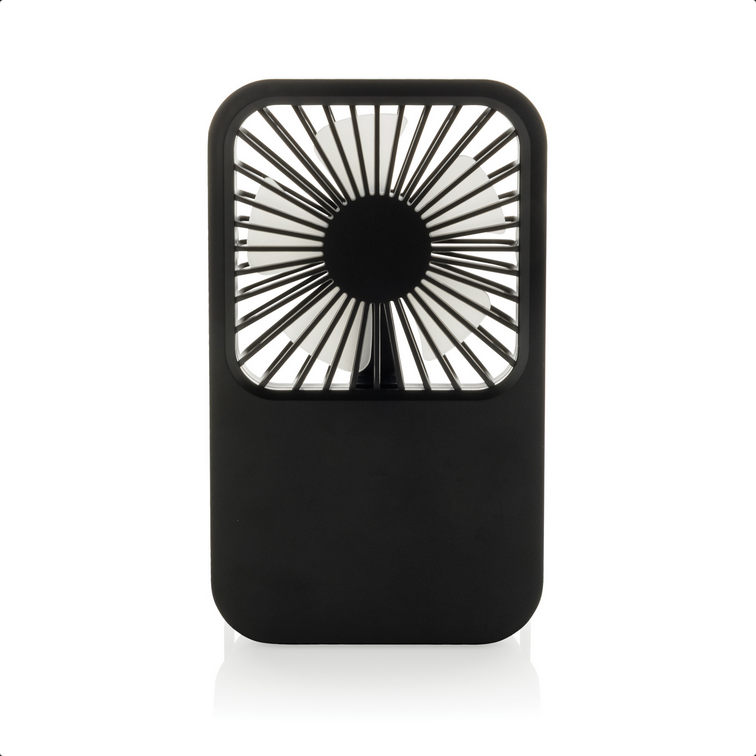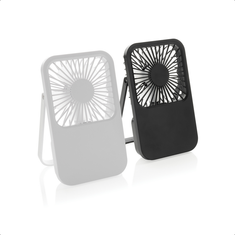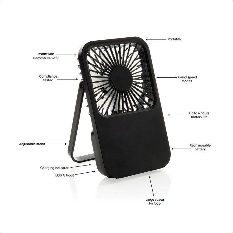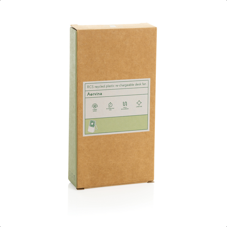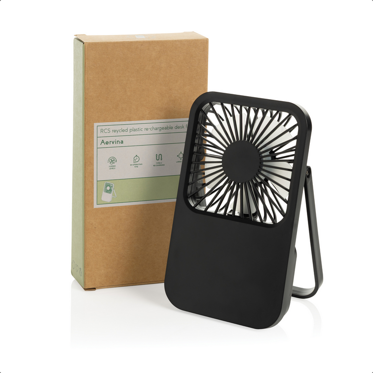 Stolový ventilátor Aervina z certifikovaného recyklovaného plastu RCS je elegantný a praktický doplnok pre domov alebo kanceláriu. Moderný čierny dizajn spája štýl s funkčnosťou. Dobíjateľná Li-ion batéria 1200 mAh poskytuje až 3 hodiny prevádzky a nabíja sa za 4 hodiny cez priložený 120 cm USB-A ↔ USB-C kábel z TPE. Ponúka tri úrovne rýchlosti a nastaviteľný stojan pre maximálne pohodlie. Vyrobené z recyklovaného ABS (RCS). RCS (Recycled Claim Standard) je štandard na overenie recyklovaného obsahu produktu v rámci celého dodávateľského reťazca. Celkový podiel recyklátu: 58 %. Bez PVC, balené v FSC® kraftovej krabičke. Max. výkon: 5 W | Vstup: 5 V / 400 mA.