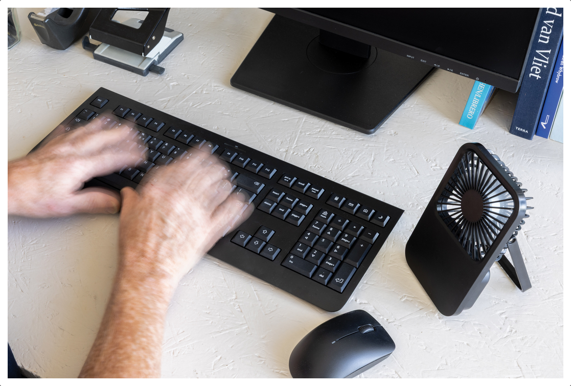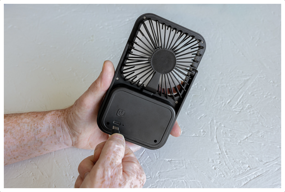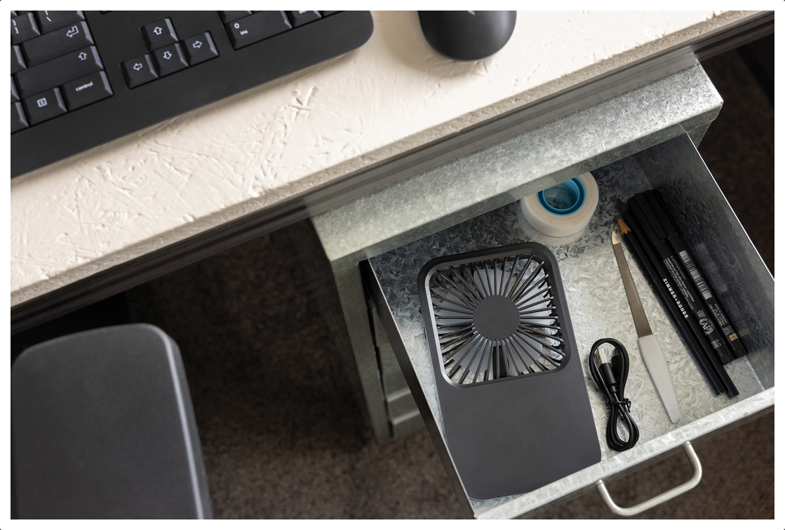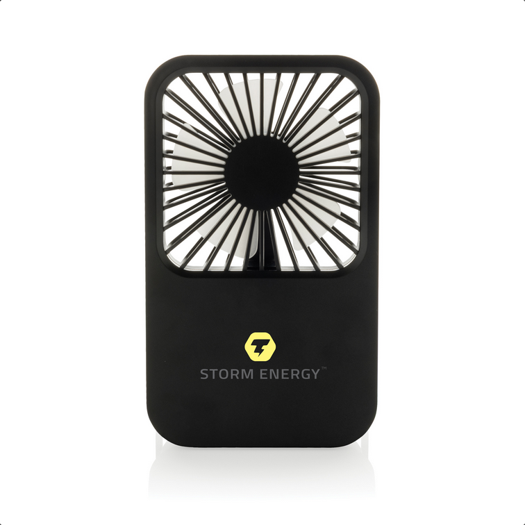 Stolový ventilátor Aervina z certifikovaného recyklovaného plastu RCS je elegantný a praktický doplnok pre domov alebo kanceláriu. Moderný čierny dizajn spája štýl s funkčnosťou. Dobíjateľná Li-ion batéria 1200 mAh poskytuje až 3 hodiny prevádzky a nabíja sa za 4 hodiny cez priložený 120 cm USB-A ↔ USB-C kábel z TPE. Ponúka tri úrovne rýchlosti a nastaviteľný stojan pre maximálne pohodlie. Vyrobené z recyklovaného ABS (RCS). RCS (Recycled Claim Standard) je štandard na overenie recyklovaného obsahu produktu v rámci celého dodávateľského reťazca. Celkový podiel recyklátu: 58 %. Bez PVC, balené v FSC® kraftovej krabičke. Max. výkon: 5 W | Vstup: 5 V / 400 mA.