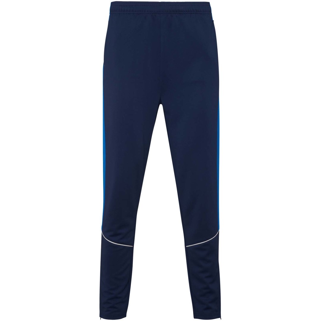 Tepláková súprava z ľahkej a elastickej látky. Bunda s kontrastnou farbou a našitým lemom na hrudi. Vysoký golier s kontrastnými švami. Stredový predný zips. Bočné vrecká. 2 × 2 rebrované manžety a pás. Nohavice s elastickým pásom a sťahovacou šnúrkou. Kontrastný bočný diel s našitým lemom. Lem na zips.