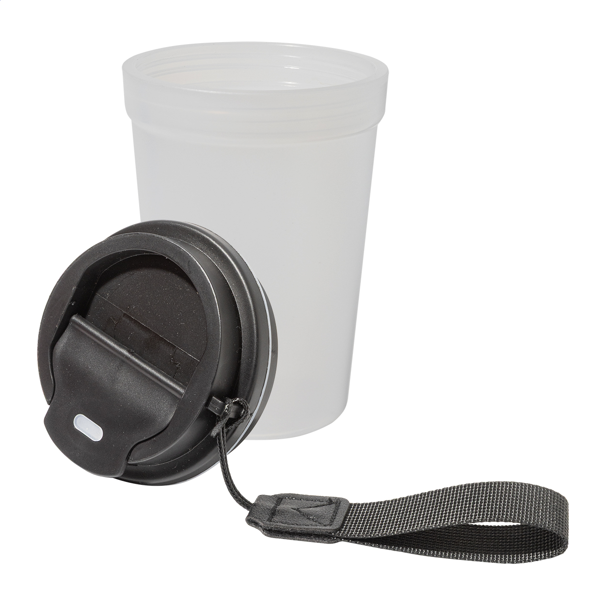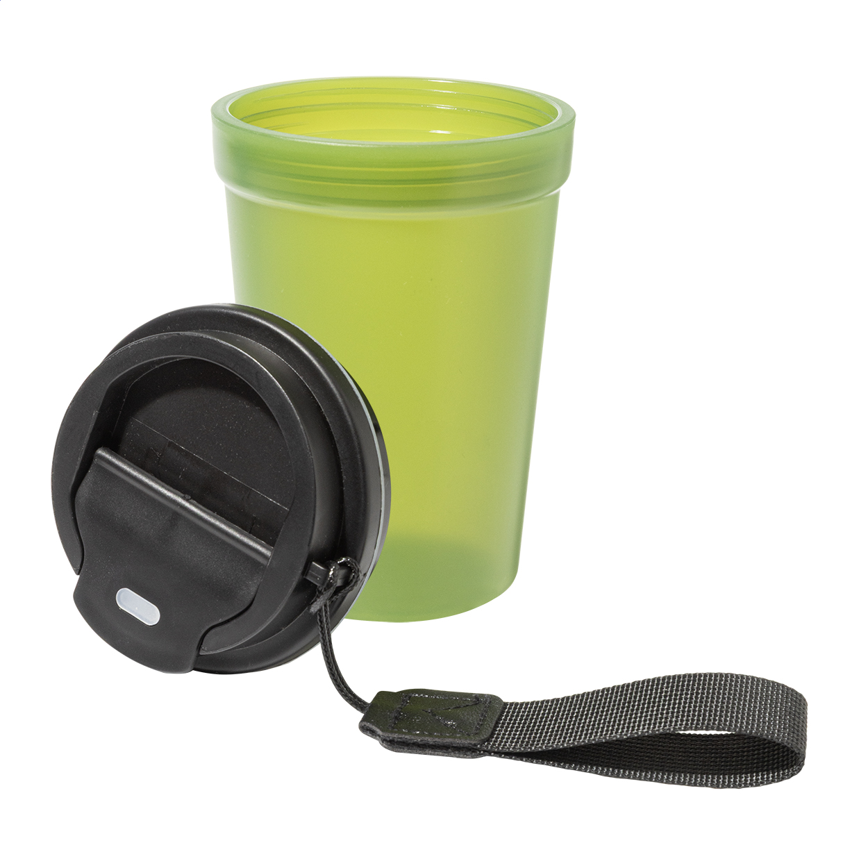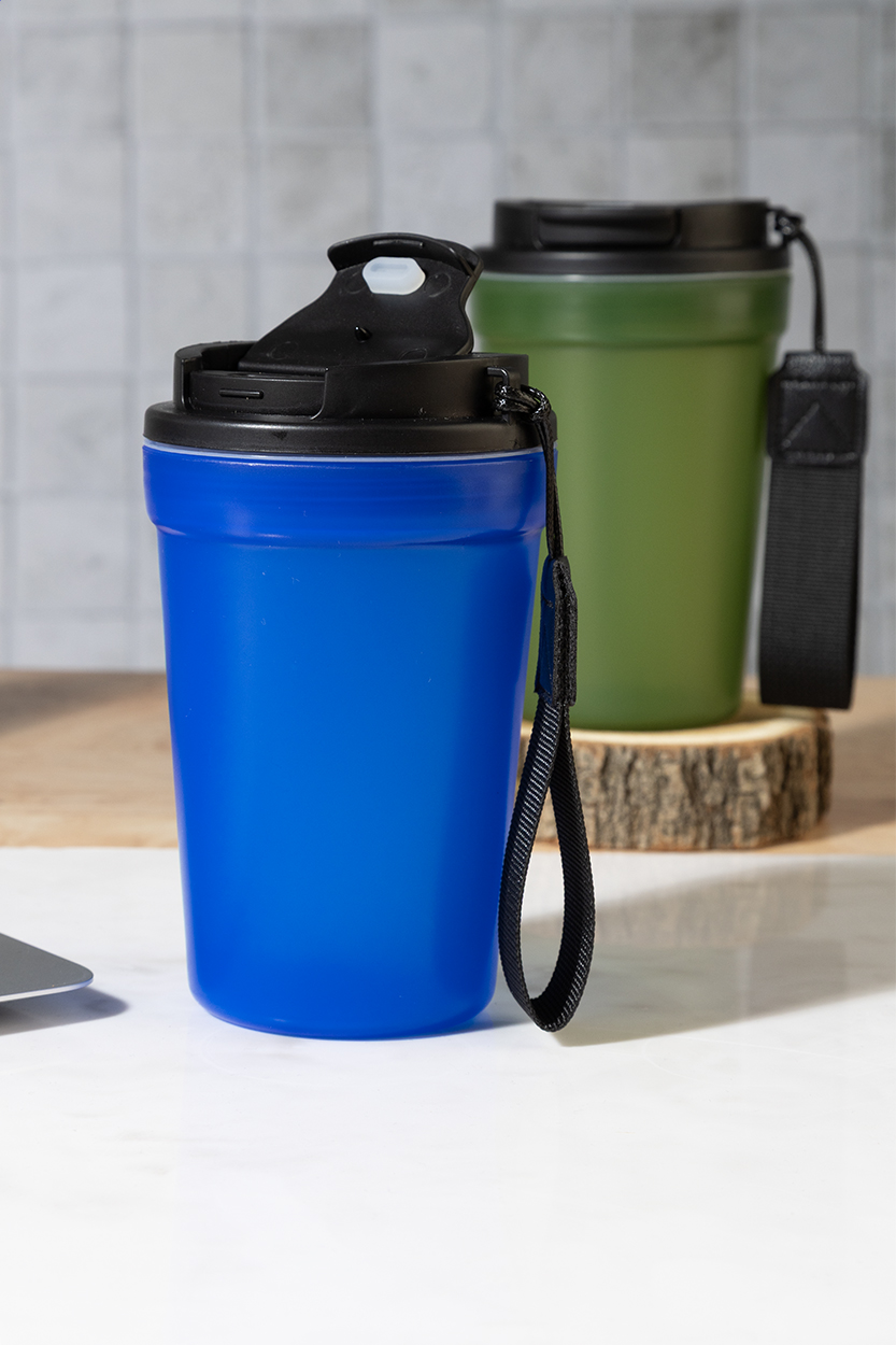 Jednostenný cestovný kelímok z PP plastu s matnou povrchovou úpravou, viečkom na pitie a popruhom z RPET polyesteru. 400 ml. New. Vhodné do umývačky riadu: Nie. Vhodné do mirkovlnnej rúry: Nie. Typ steny: Jedna stena. Odolné voči poliatiu / nepriepustné: Odolné voči poliatiu