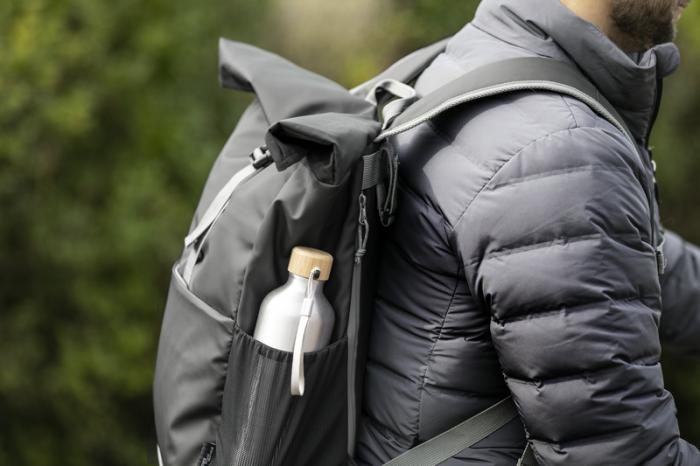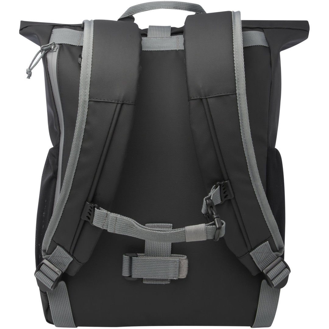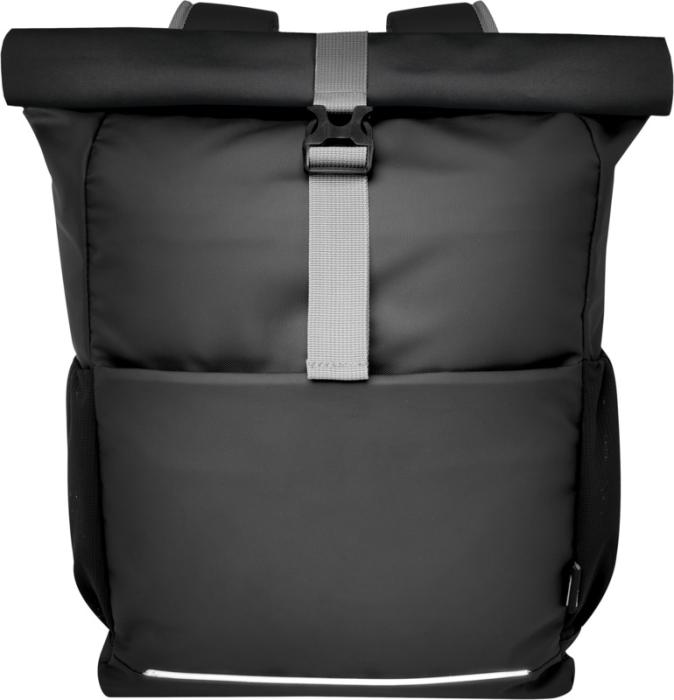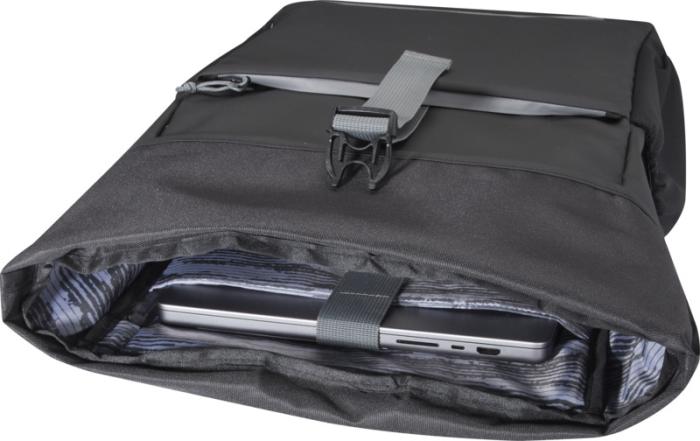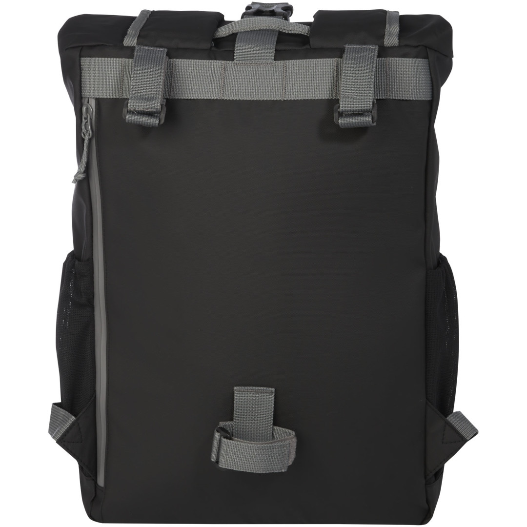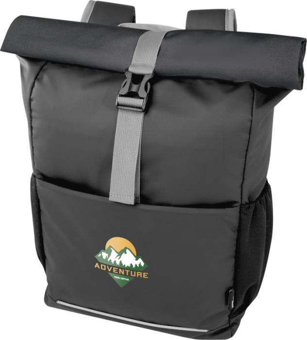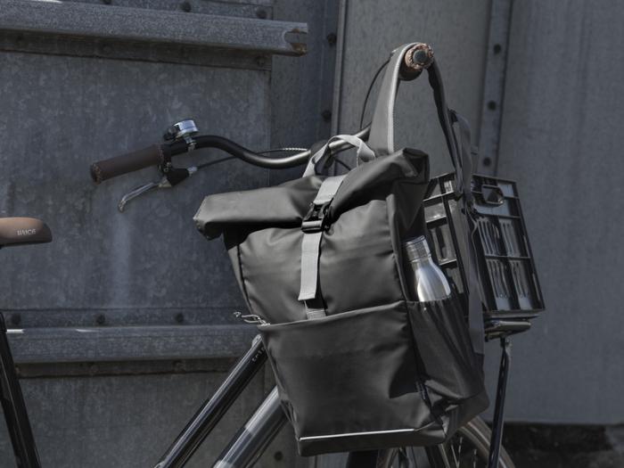 Vodeodolná rolovacia taška na bicykel vyrobená z GRS certifikovaných recyklovaných materiálov. Je vybavená polstrovanou priehradkou na 15" notebook, niekoľkými organizačnými vreckami, nastaviteľným zapínaním na suchý zips pre ľahké nasadenie na rôzne bicykle a reflexným lemovaním pre lepšiu viditeľnosť. Z recyklovaných materiálov GRS je vyrobená hlavná tkanina, podšívka, popruhy a zipsy. Kapacita: 20 litrov, neobsahuje PVC.