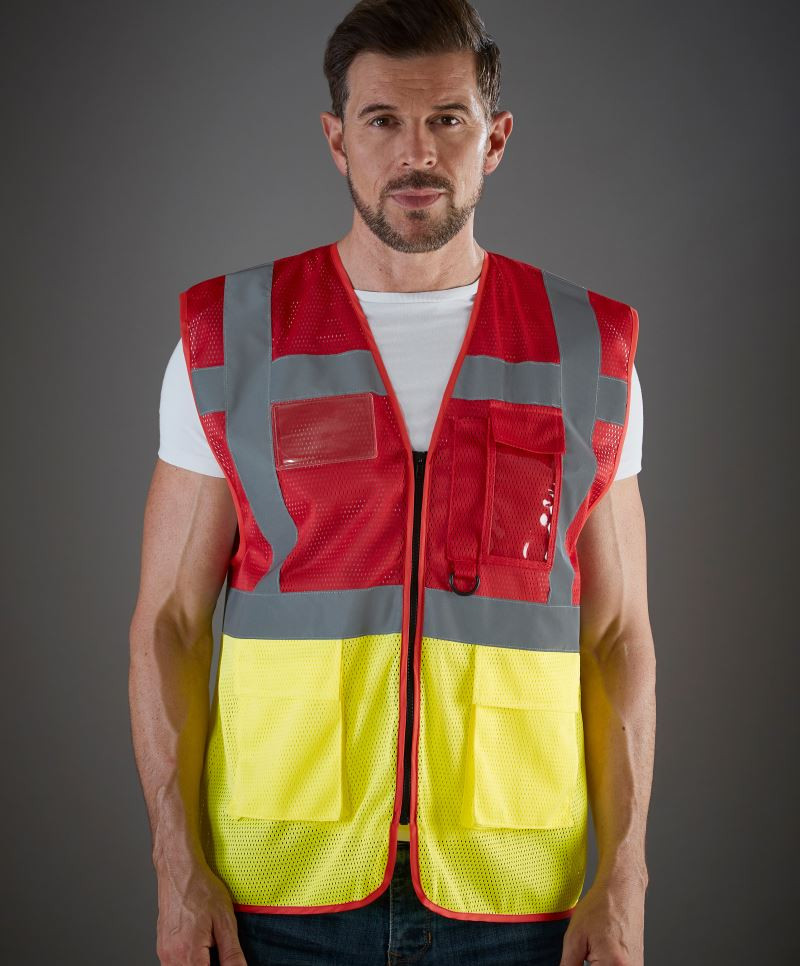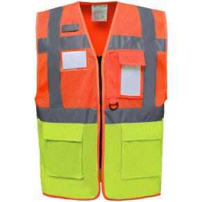 Perforovaný materiál, celoprepínací zips, 2 bočné vrecká s chlopňami, vrecko na doklady, rôzne funkčné vrecká, všité náprsné vrecko, integrovaný držiak na pero, krúžok na pripevnenie kariet, kľúčov atď, ľahký materiál, certifikovaný podľa normy EN ISO 20471 triedy 1 a 2, zaručené reflexné vlastnosti podľa normy EN - 25 praní, 1 reflexný prúžok cez každé rameno, dva reflexné prúžky široké 5 cm okolo tela, možnosť prania na 40°