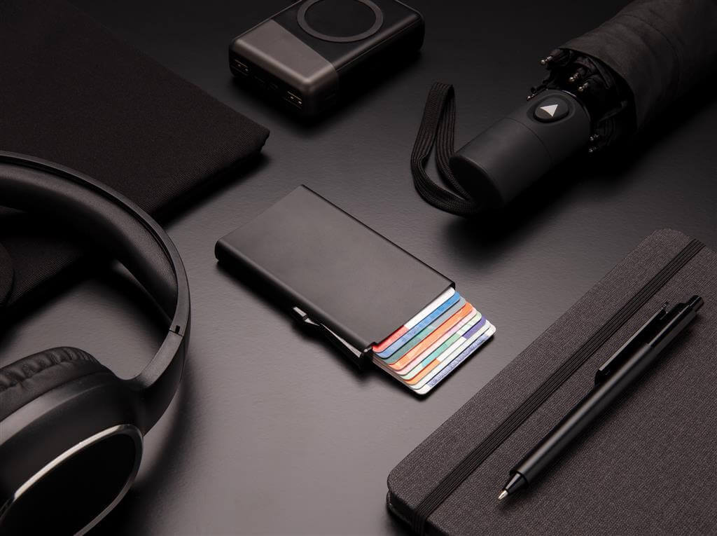 Pevné hliníkové puzdro chrániace karty pred skimmingom alebo fyzickým poškodením. Pojme až 10 štandardných alebo 6 embosovaných kariet. Postranné jazdec pre postupné vysunutie všetkých kariet.