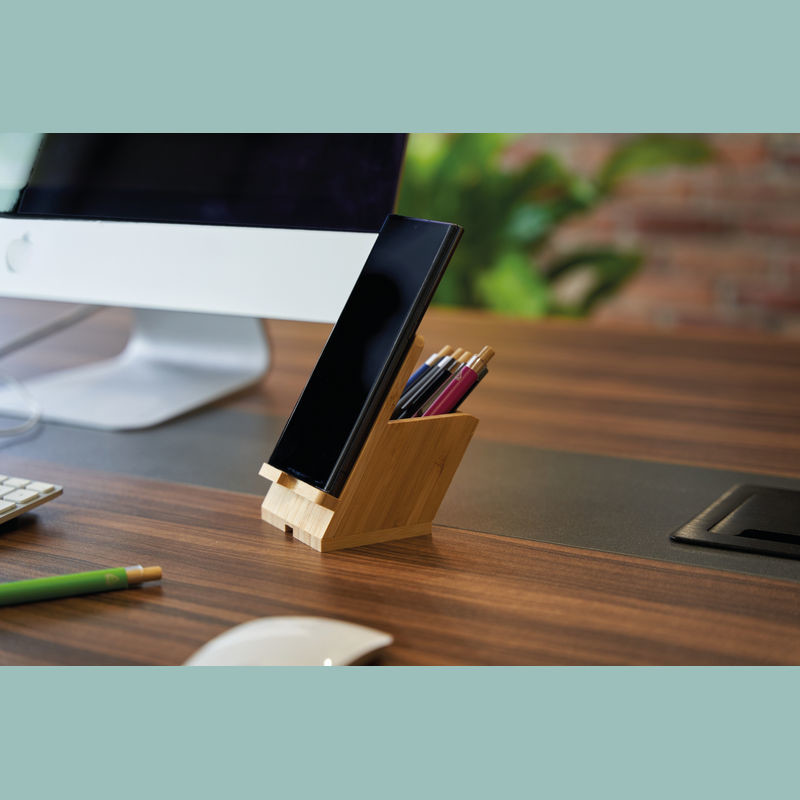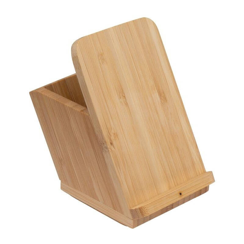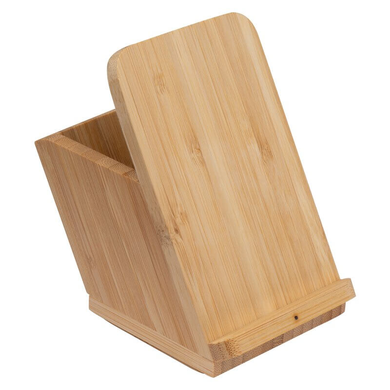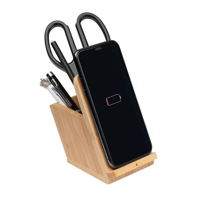 Bambusový držiak na pero s bezdrôtovou nabíjačkou pre zariadenia, ktoré podporujú túto funkciu. Keď je nabíjačka úplne nabitá, predné svetlo svieti nazeleno. Nabíjací kábel je súčasťou balenia. Spôsob potlače gravírovanie.