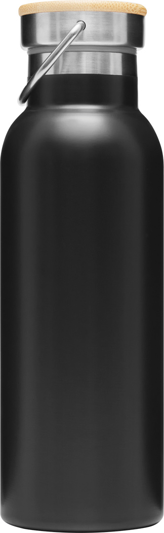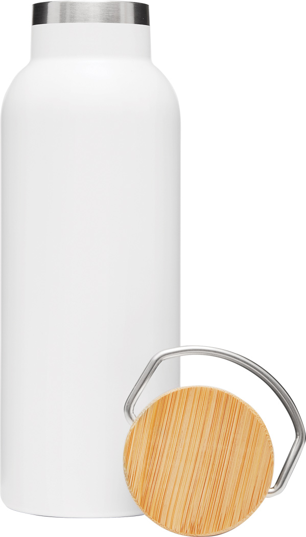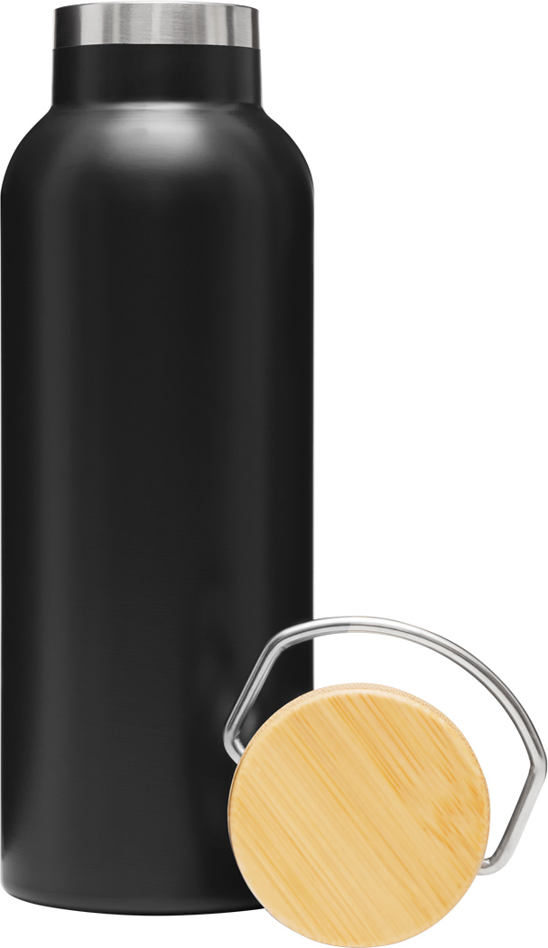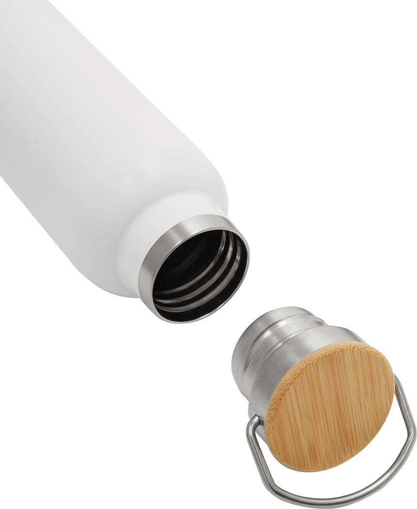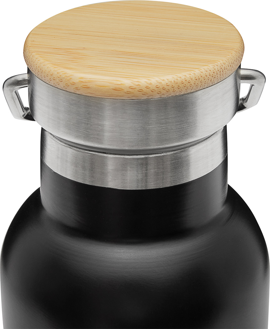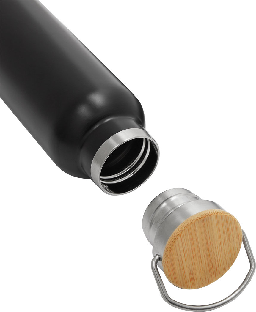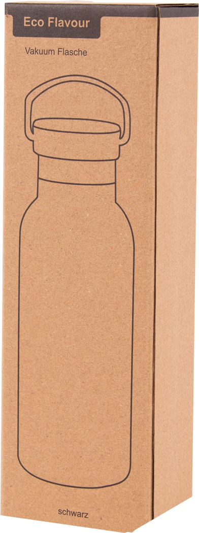 Izolovaná fľaša na pitie ECO FLAVOR , dvojplášťová: vnútorná a vonkajšia z nehrdzavejúcej ocele, bezpečný skrutkovací uzáver z bambusu so silikónovým tesnením a pútkom na prenášanie, kapacita cca. 500 ml, udrží teplo až 8 hodín a studené až 12 hodín.