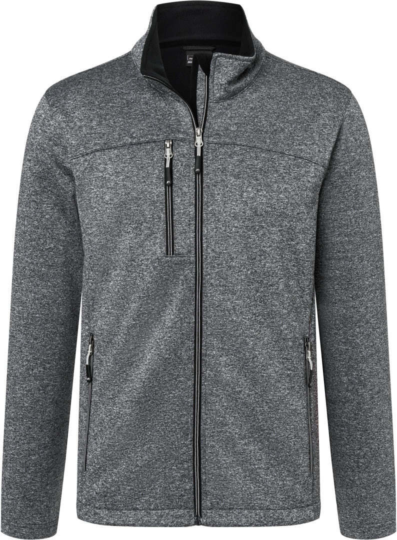 280g / m², 100% polyester 2 vrstvový softshell materiál, Dotyk podobný hladkému fleece materiálu, stojacie golier, prepínanie na podložený zips s chráničom brady, 2 bočné vrecká a 1 náprsné vrecko na zips, vnútri fleece v kontrastnej farbe