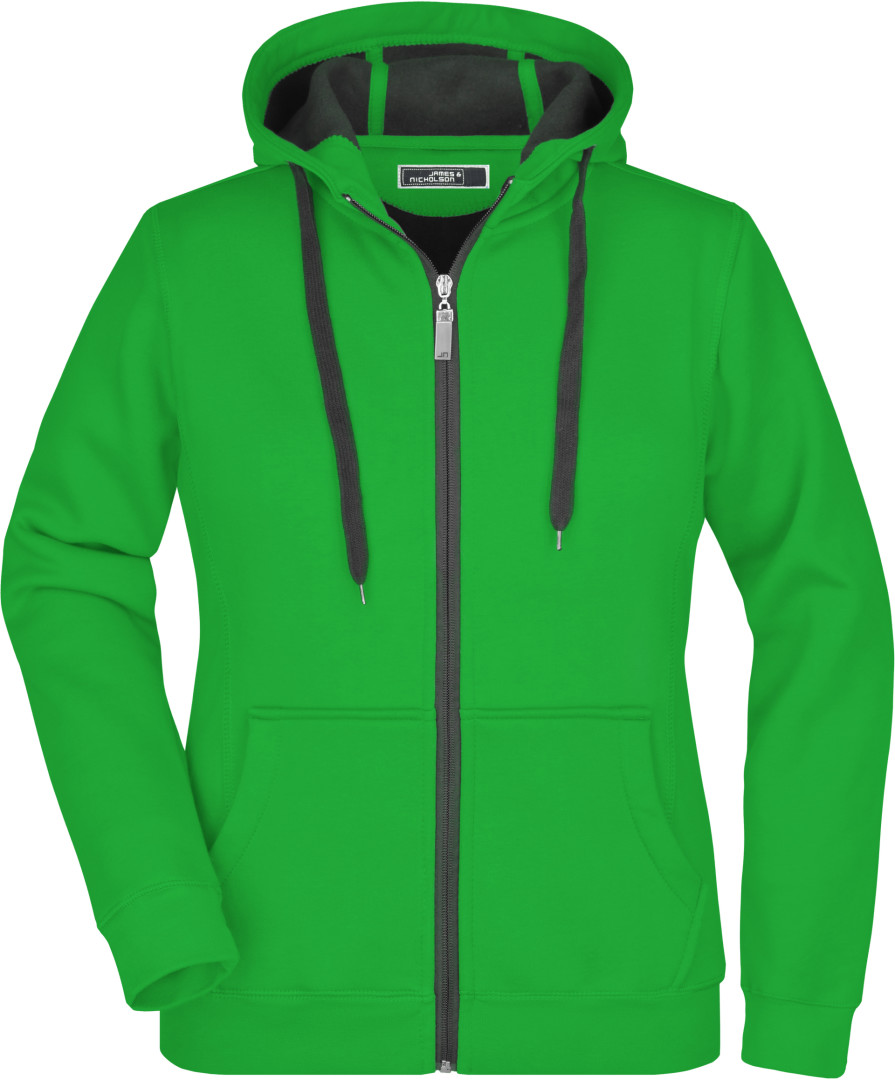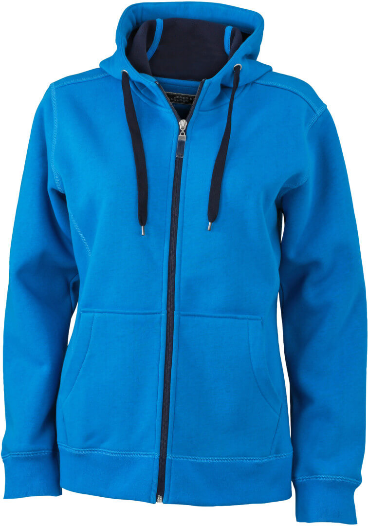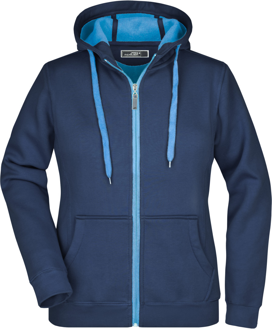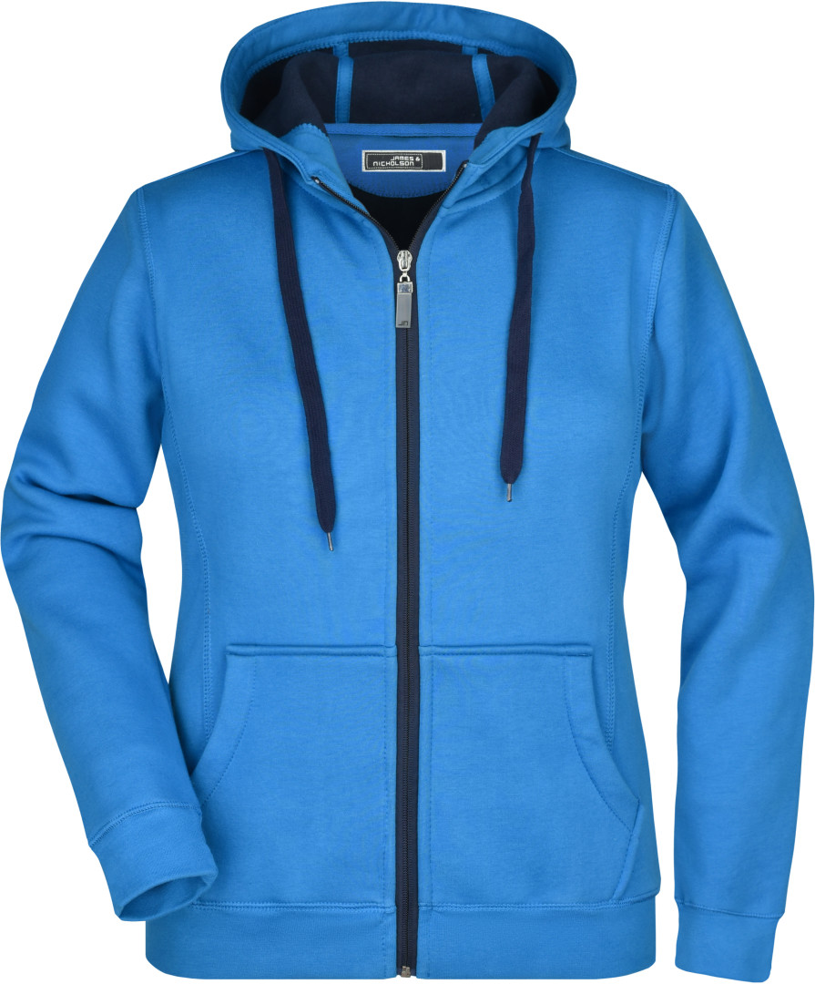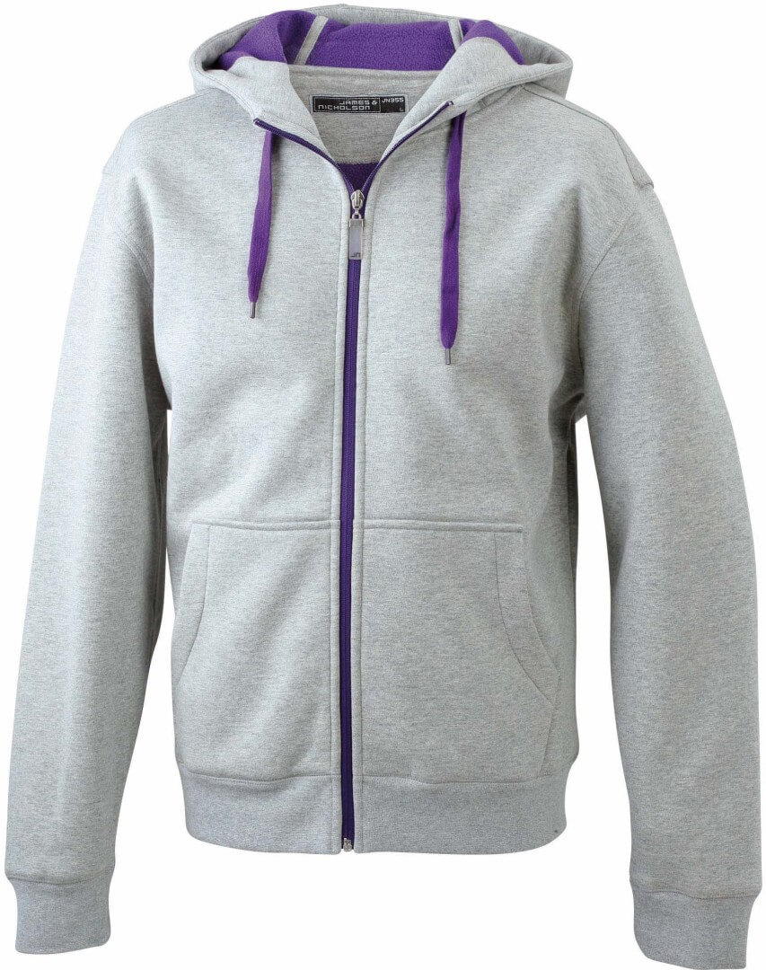 380g/m², vonkajšia vrstva: 55% polyester, 45% bavlna, vnútorná vrstva: mikrofleece, ľahko vypasovaná, dvojvrstvová, teplá, kapucňa, sťahovacia šnúrka a zips v kontrastnej farbe, kapucňa s ochranou brady, elastické manžety a lem, vsadené rukávy, klokanie vrecko, ploché stehy