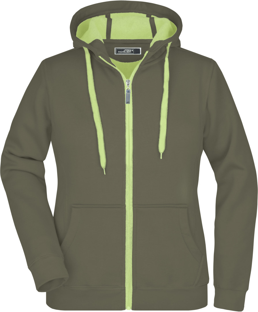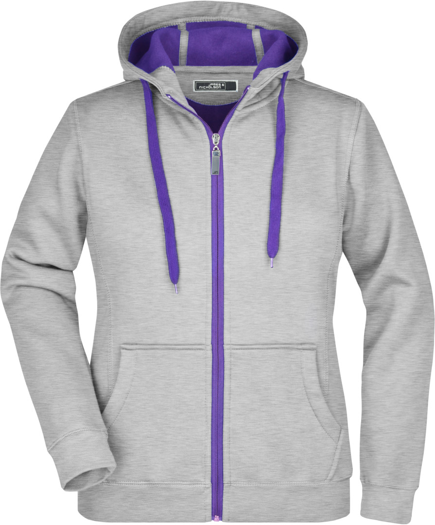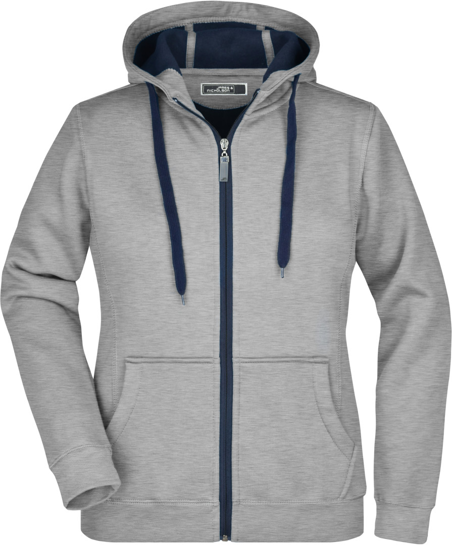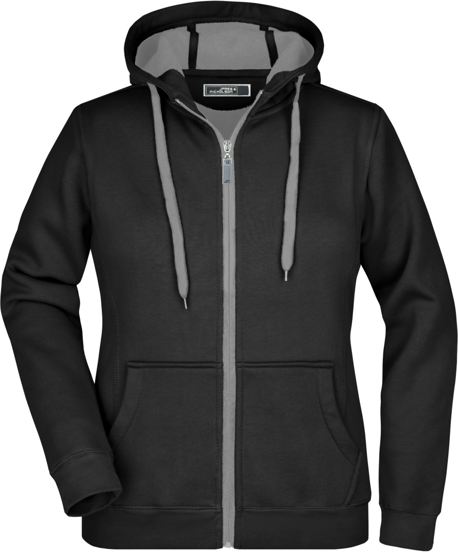 380g/m², vonkajšia vrstva: 55% polyester, 45% bavlna, vnútorná vrstva: mikrofleece, ľahko vypasovaná, dvojvrstvová, teplá, kapucňa, sťahovacia šnúrka a zips v kontrastnej farbe, kapucňa s ochranou brady, elastické manžety a lem, vsadené rukávy, klokanie vrecko, ploché stehy