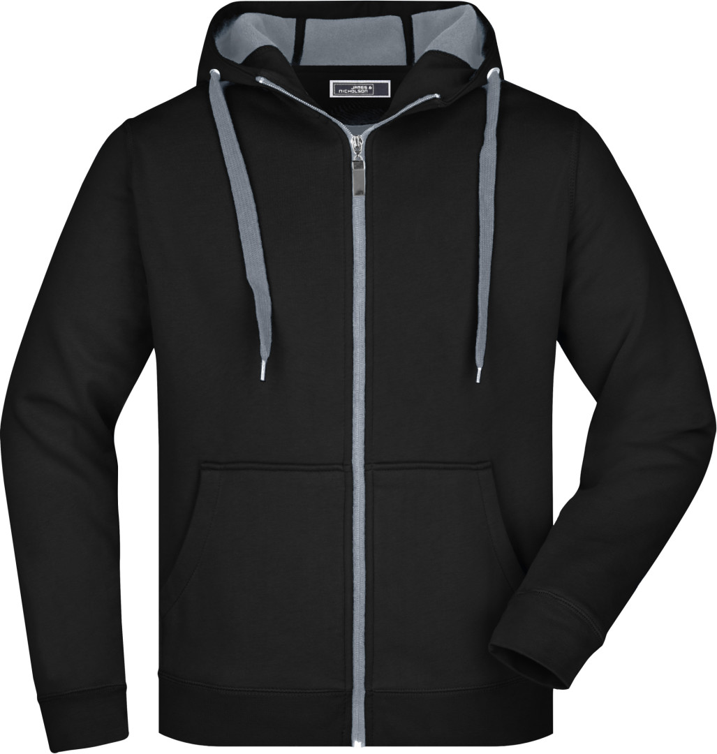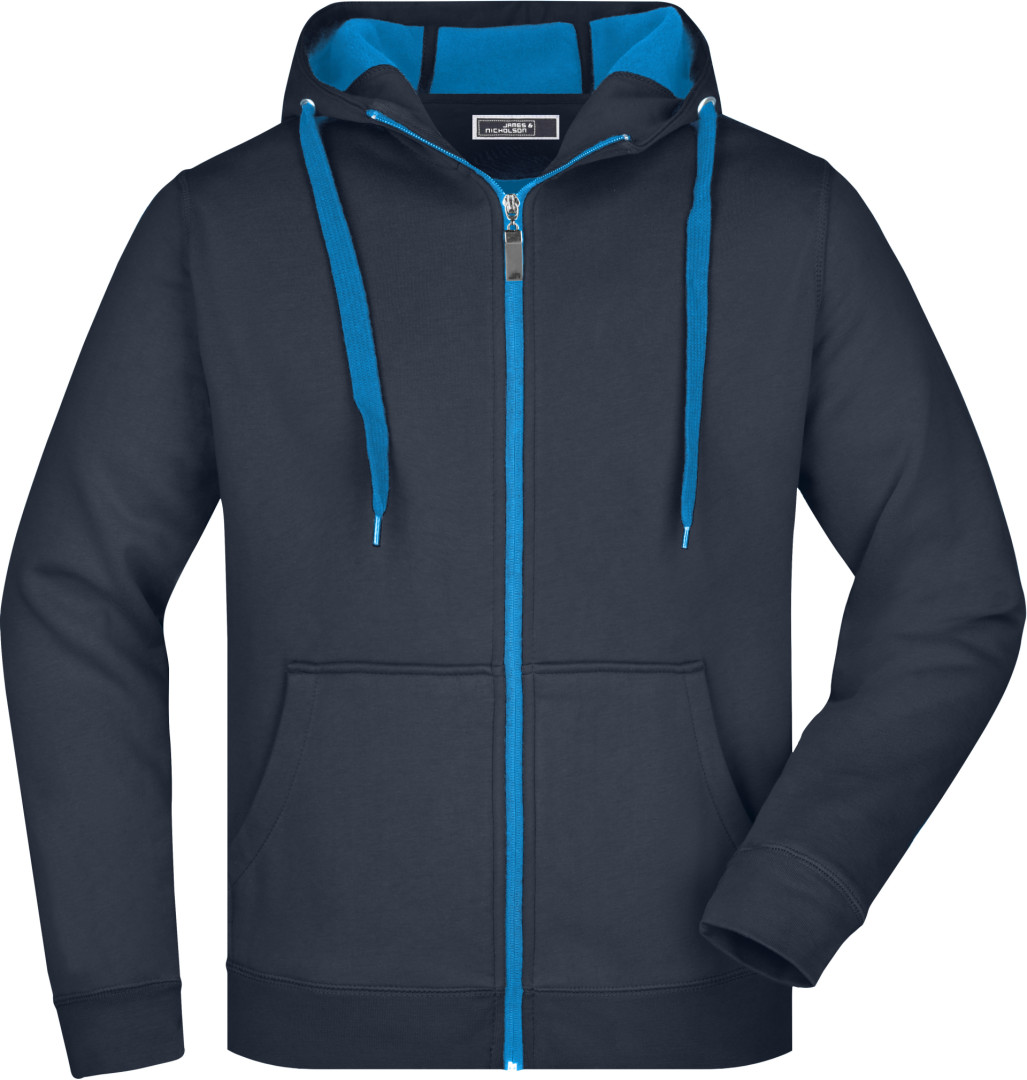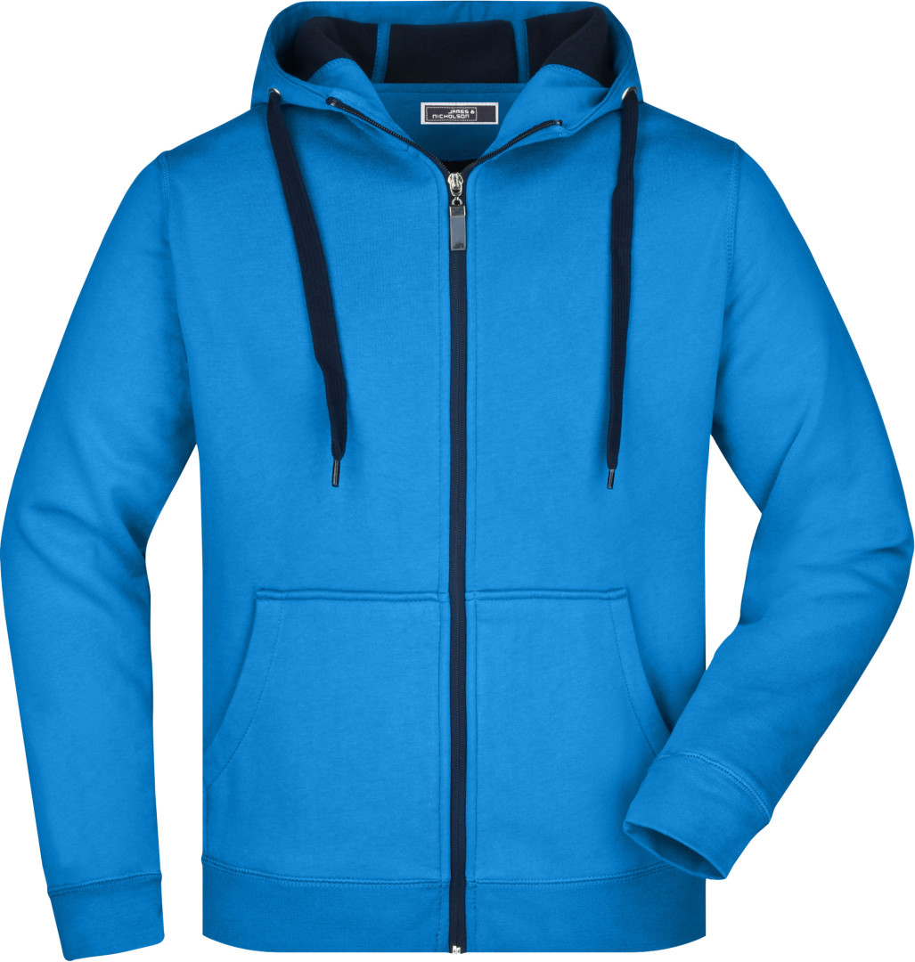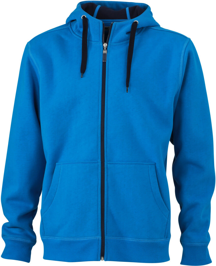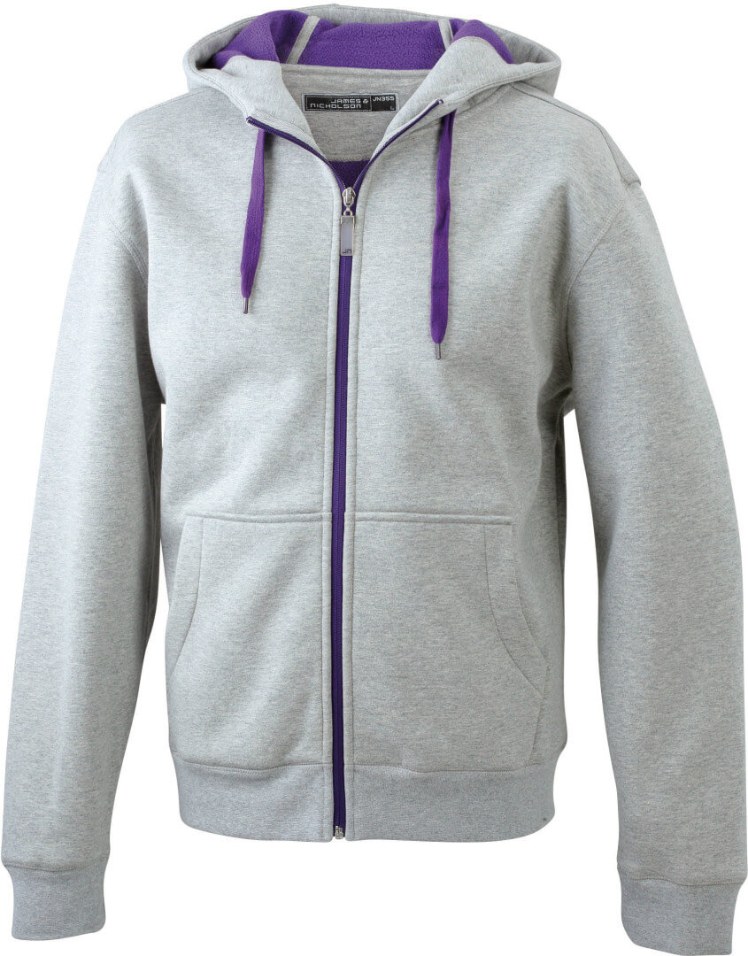 380g/m², vonkajšia vrstva: 55% polyester, 45% bavlna, vnútorná vrstva: mikrofleece, dvojvrstvová, teplá, kapucňa, sťahovacia šnúrka a zips v kontrastnej farbe, kapucňa s ochranou brady, elastické manžety a lem, vsadené rukávy, klokanie vrecko, ploché stehy