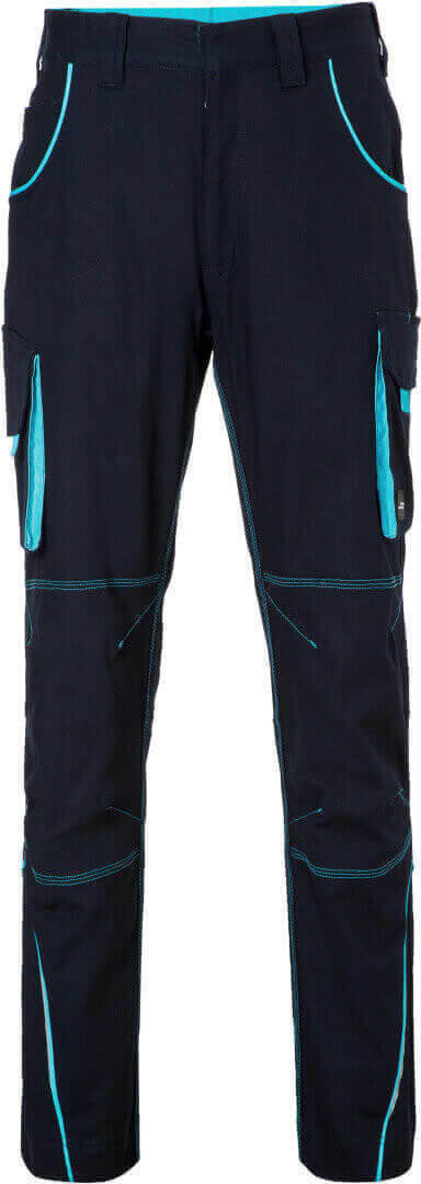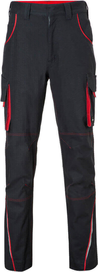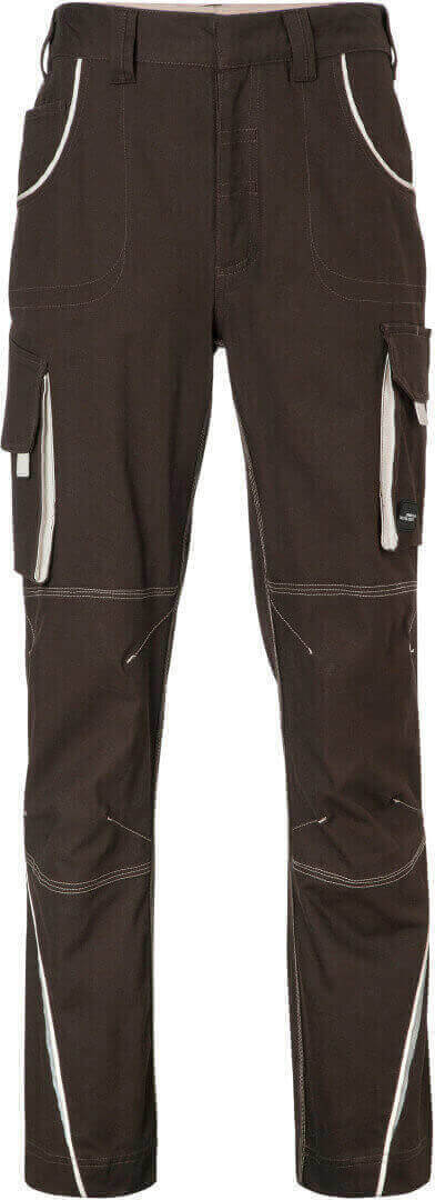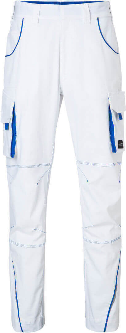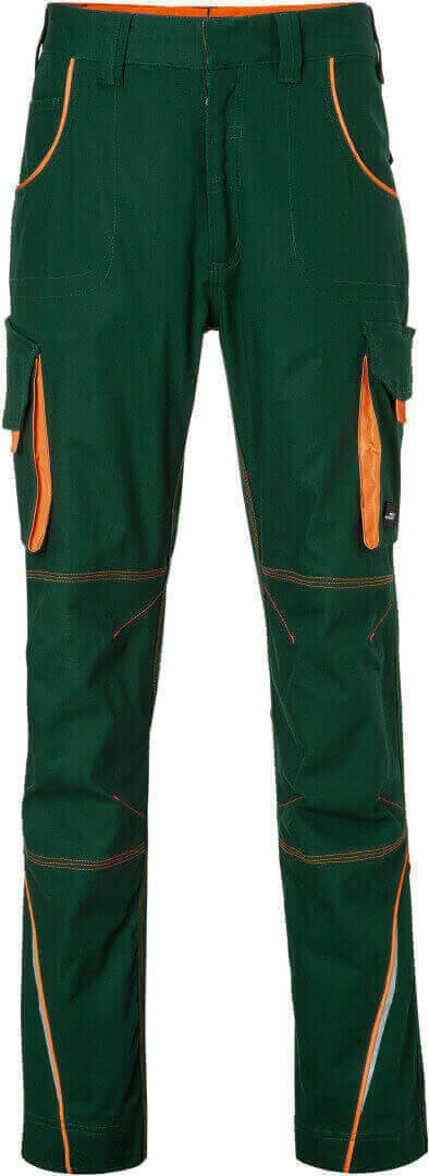 250g / m², 97% bavlna, 3% elastan ľahké elastické plátno, pohodlné nosenie vďaka elastanu a ergonomickému strihu, odolné trojité prešitie, elastický pás s pútkami, vrecko na meter, vrecká na náradie, držiaky na perá a vrecko na mobil, reflexné prvky na prednej i zadnej strane, skryté zipsy a gombíky