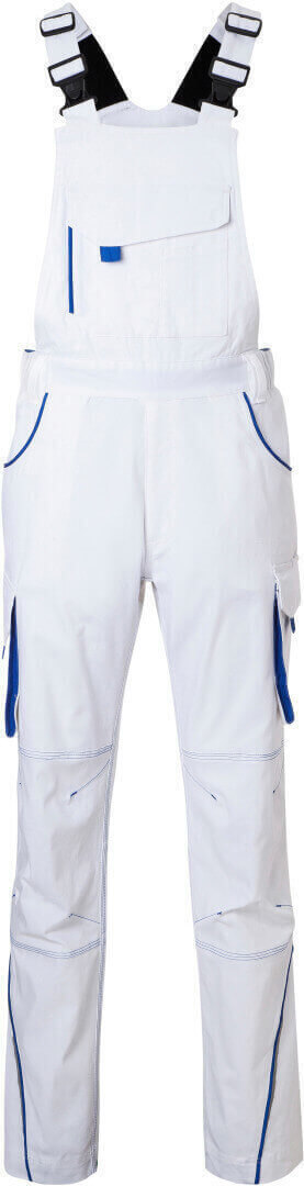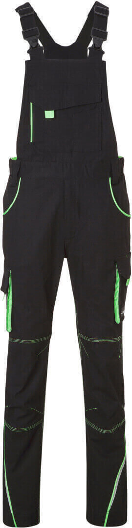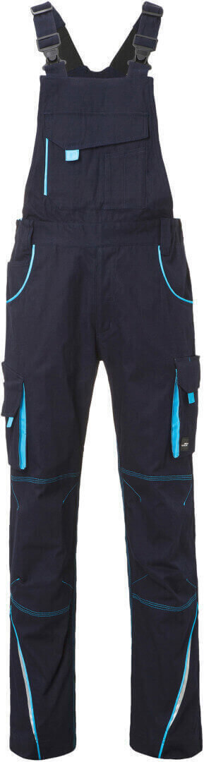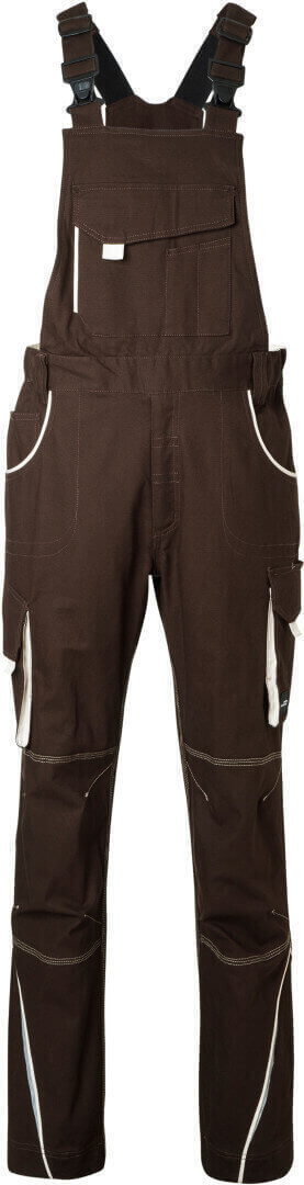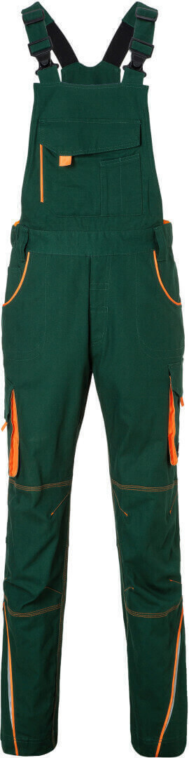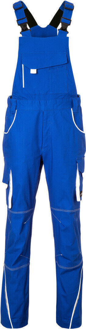 ľahké elastické plátno, pohodlné nosenie vďaka elastanu a ergonomickému strihu, odolné trojité prešitie, traky s nastaviteľnými elastickými trakmi, vrecko na meter, vrecká na náradie, držiaky na perá, vrecko na mobil a veľké vrecko na zips na lacla, reflexné prvky na prednej i zadnej strane, skryté zipsy a gombíky, možno prať na 60 ° a sušiť v sušičke