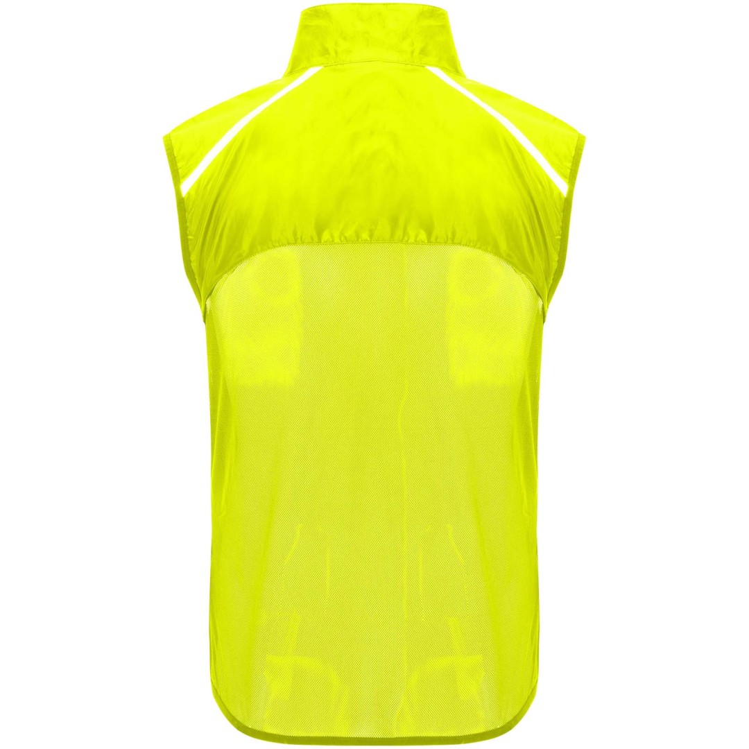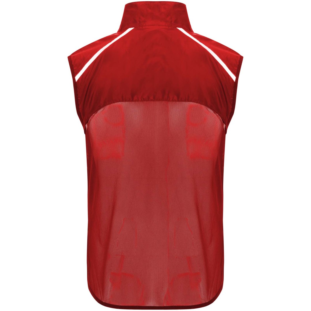 Vetruodolná a priedušná. Predný zips so zodpovedajúcim chráničom brady. Elastické lemovanie v prieramkoch a na spodnom okraji. Spodná časť chrbta z mikroperforovanej látky. Vysoko viditeľné detaily na hornej, prednej a zadnej strane. Vrecko s elastickým pásikom na uloženie vesty a jej nosenie na zápästí. Odnímateľný štítok.
