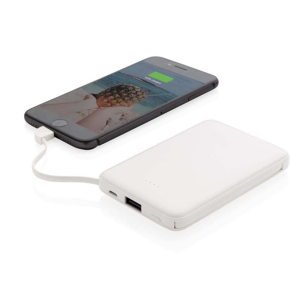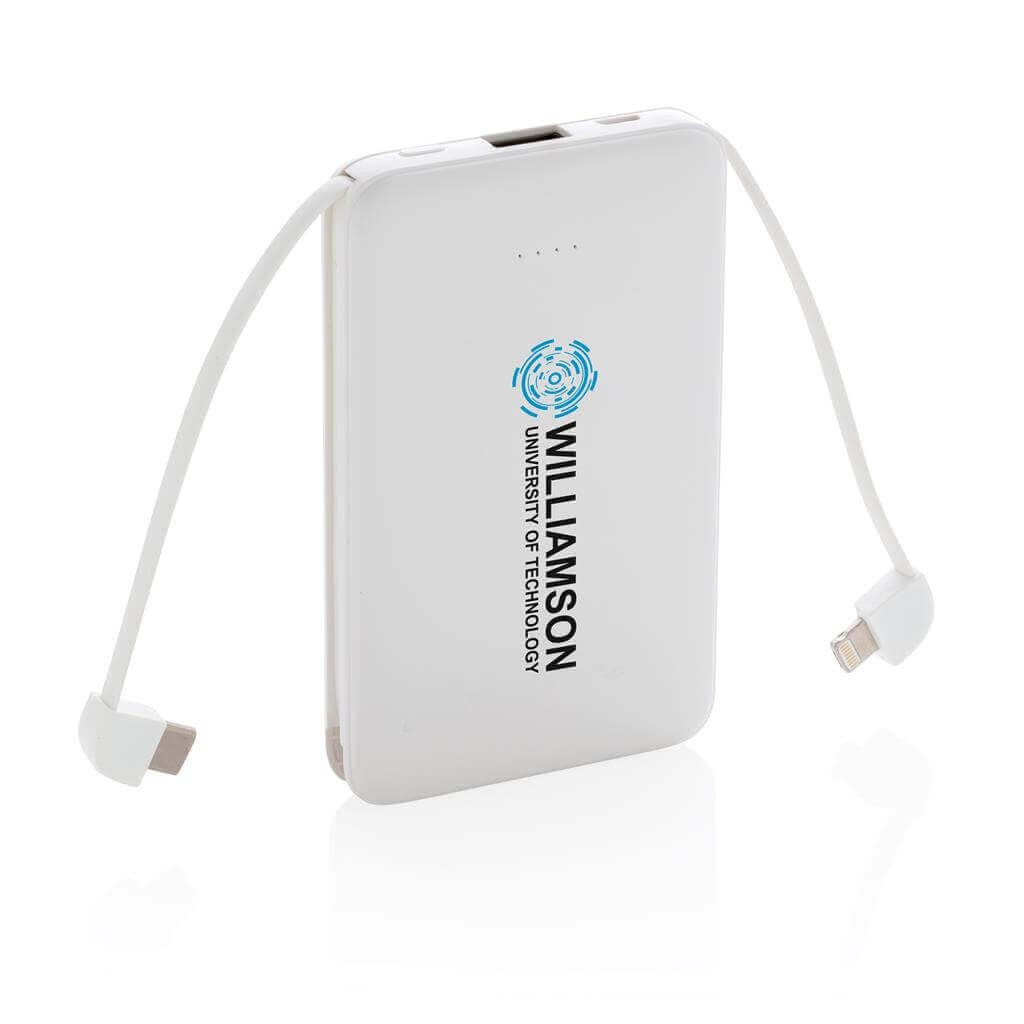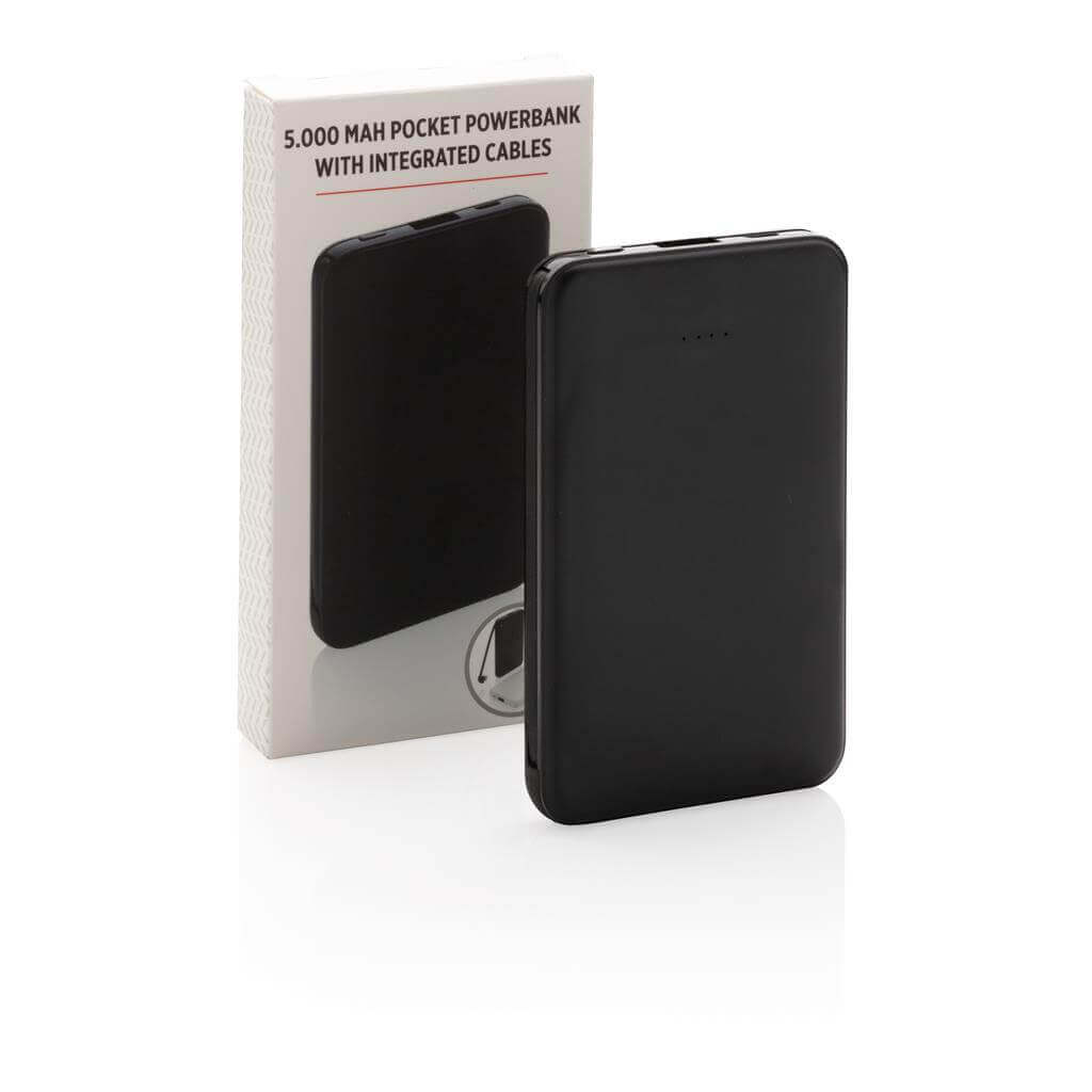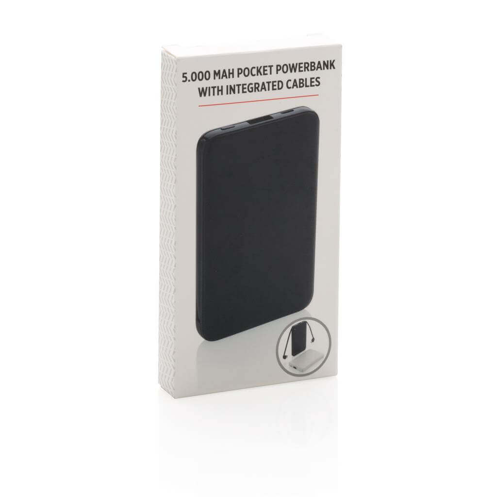 Kompaktná tenká PowerBank vyrobená z odolného ABS s integrovaným TPE káblom 3 v 1, pomocou ktorého nabijete akýkoľvek telefón na trhu. Obsahuje vysoko kvalitné lítium polymérovú batériu série A s kapacitou 5 000 mAh. Poskytuje tak dostatok energie pre plné nabitie vášho telefónu až 2x. Vrátane indikátorov stavu nabitia. Vstup 5V / 2A; Výstup 5V / 2A. 1 batériou typu Li-poly v balení.