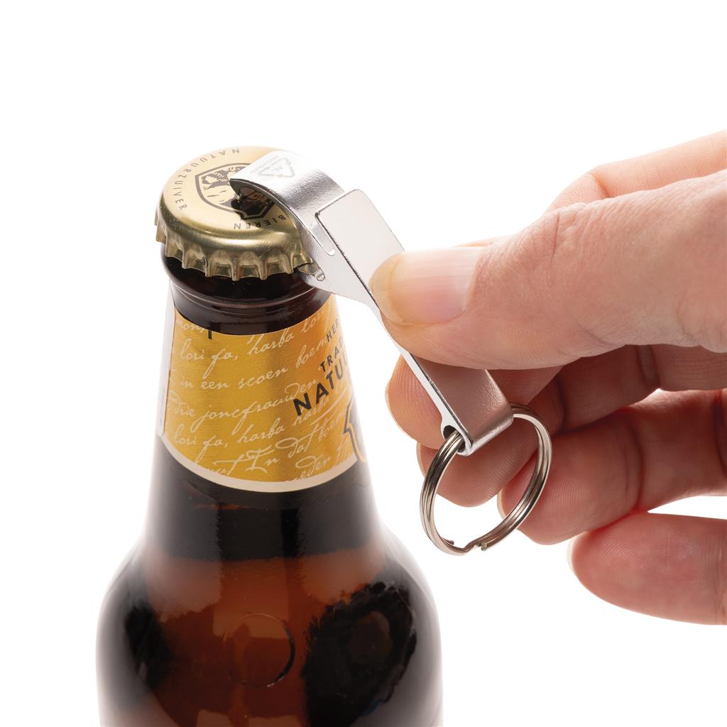 Kľúčenka s otváračom na fľaše a plechovky. Vyrobená z RCS recyklovaného hliníka. RCS certifikácia zaisťuje garanciu použitia recyklovaného materiálu vďaka transparentnému prehľadu nad dodávateľským reťazcom. Celkový podiel recyklátu podľa váhy produktu: 79 %. Balené v papierovom obale.