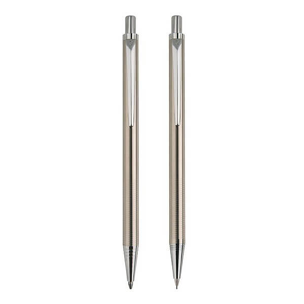 Luxusná sada guličkového pera a mikroceruzky Pierre Cardin v striebornej farbe, hliníkové telo s jednoduchým klipom, jemné rytie na povrchu vo výške úchopu, guličkové pero obsahuje kvalitné modrú náplň s hrotom 1 mm, mikroceruzka s tuhou 0,5 mm. Balené v luxusnom vrecku Pierre Cardin, dodávané s certifikátom pravosti. Rozmery: guľôčkové pero 0,7 × 14 cm, mikroceruzka 0,7 × 14 cm, balenie 7 × 15,5 cm.