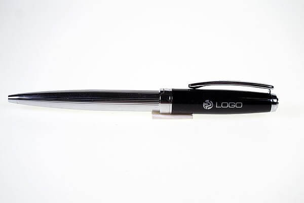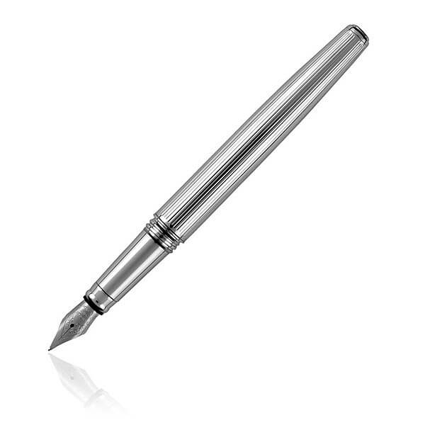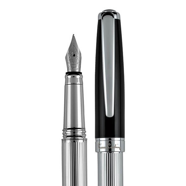 Luxusná súprava kovových písacích potrieb značky Pierre Cardin v masívnom dizajne kombinácia striebornej a čiernej farby s jemným rytím na tele. Sada obsahuje plniace pero a roller, ktorých hrot je chránený krytom v čiernej farbe. Roller obsahuje značkovú nemeckú náplň Schmidt® v modrej farbe s hrotom 0,6 mm a náhradnú čiernu náplň, plniace pero 1ks bombičky s modrým atramentom. Sú balené v luxusnej krabičke Pierre Cardin, dodávané s certifikátom pravosti. Rozmery: plniace pero 1 × 13,7 cm, roller 1 × 13,7 cm, balenie 17,5 × 6,7 × 3,5 cm.