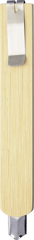 Kovový nôž s bambusovým telom. Na zadnej strane je kovová spona na pripevnenie noža, keď sa nepoužíva. Čepele sú vyrobené z uhlíkovej ocele. Individuálne zabalené do recyklovaného polyetylénového vrecka. Rozmery: 1,8 x 13 x 1,4 cm