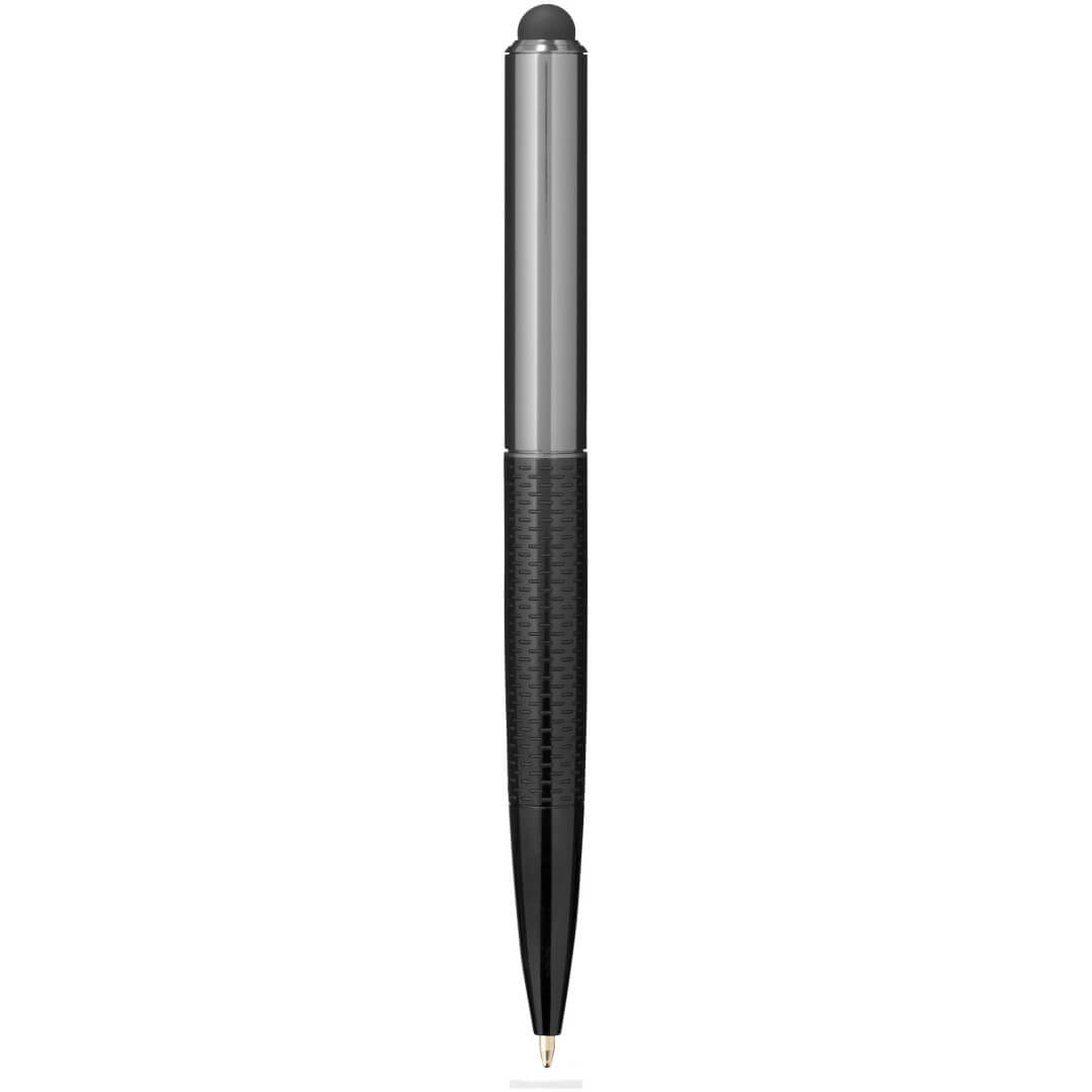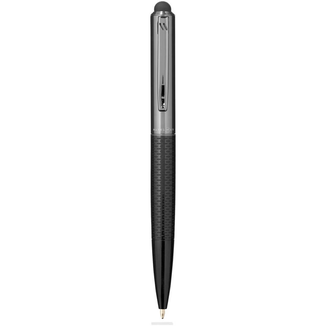 Guľôčkové pero a stylus Dash. Exkluzívne dizajnové guľôčkové pero so štýlovým spodným panelom. Zahŕňa vysoko kvalitné čiernu atramentovú náplň a je balené v darčekovej kazete značky Marksman. Kov.