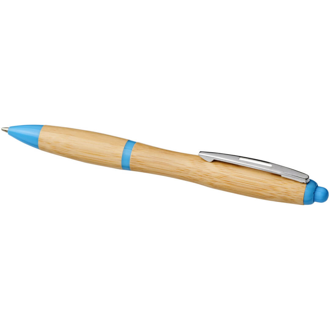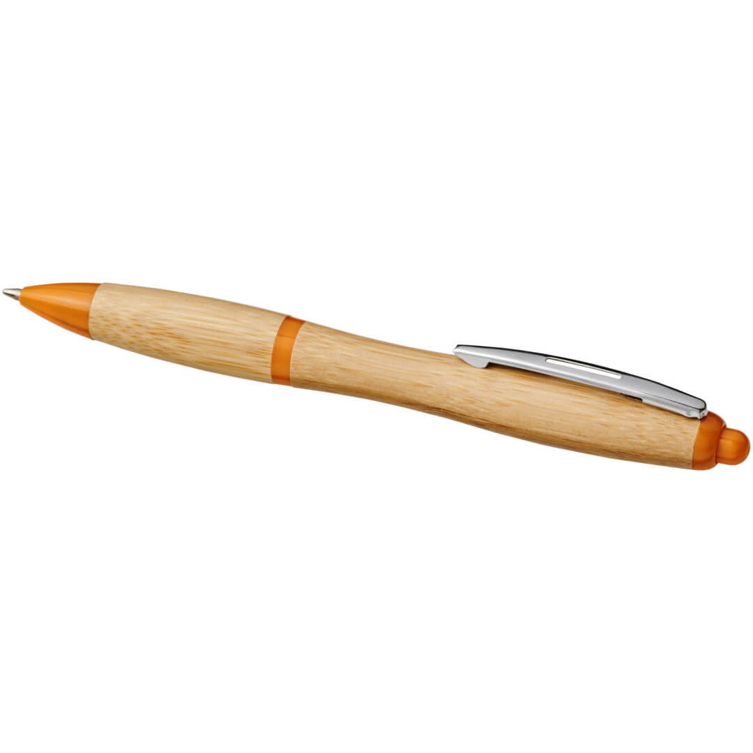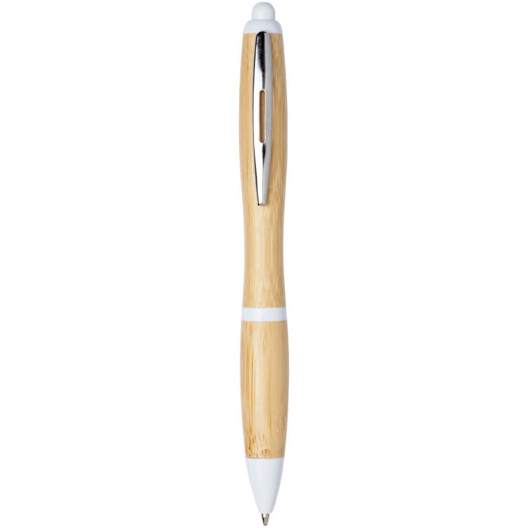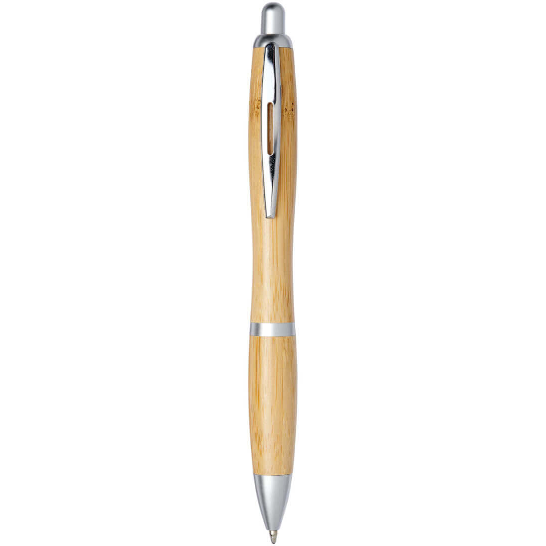 Guľôčkové pero Nash z bambusu. Ekologické guľôčkové pero so stláčacím mechanizmom, telom vyrobeným z bambusu, s detailmi z ABS plastu a chrómovou sponou. Farba bambusového materiálu sa môže rôzniť. Bambus, plast ABS.