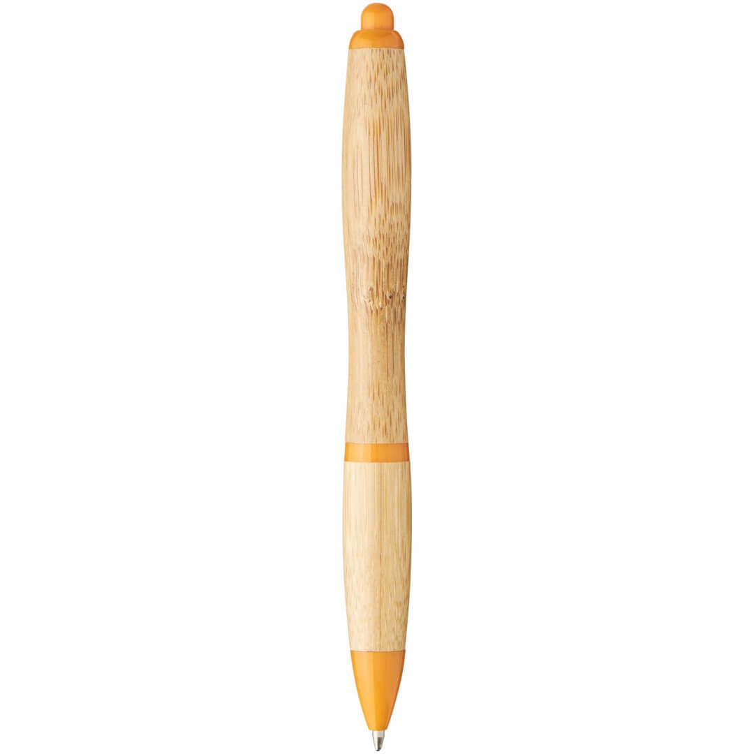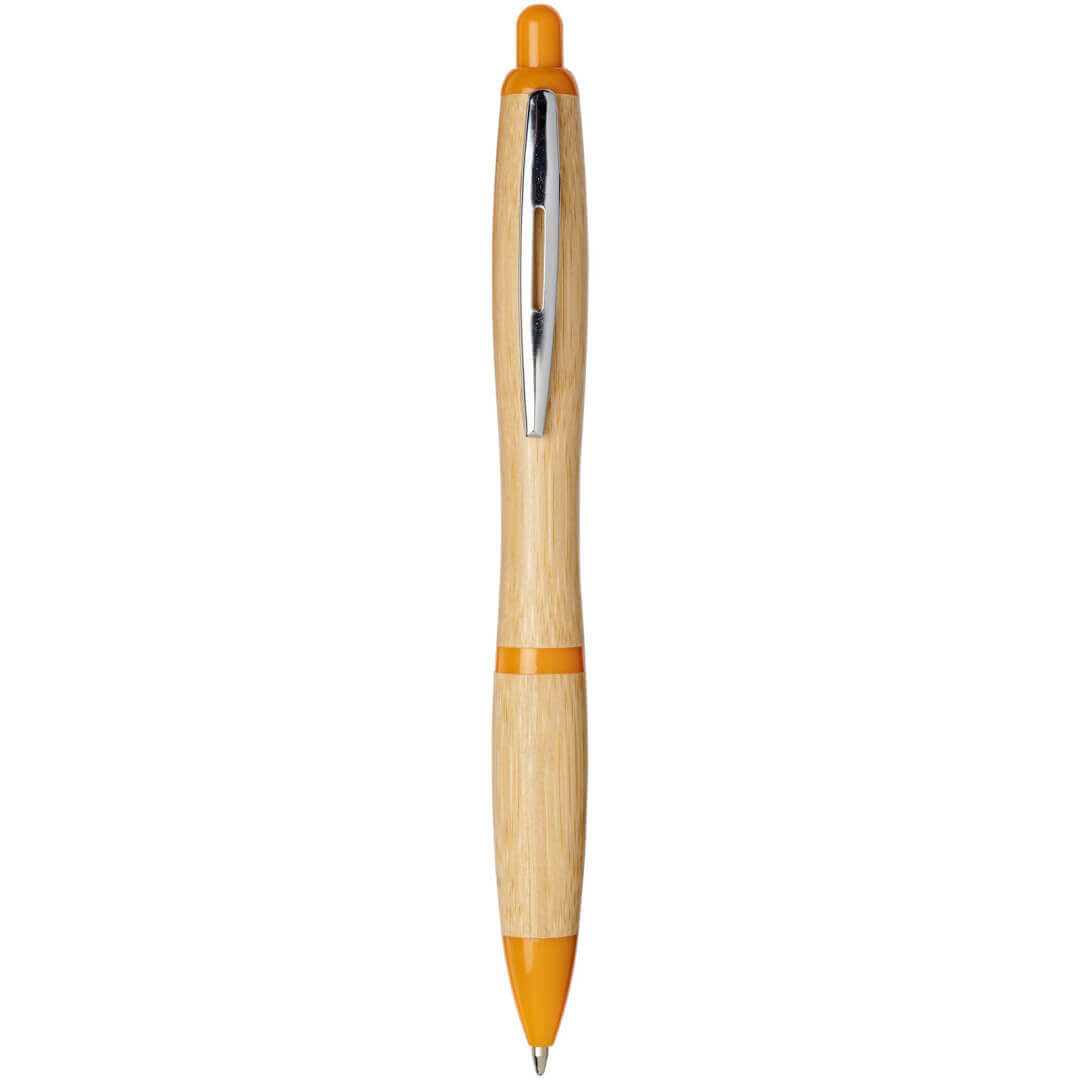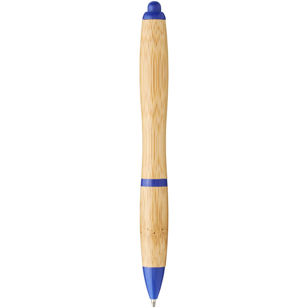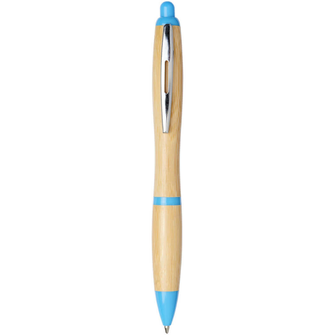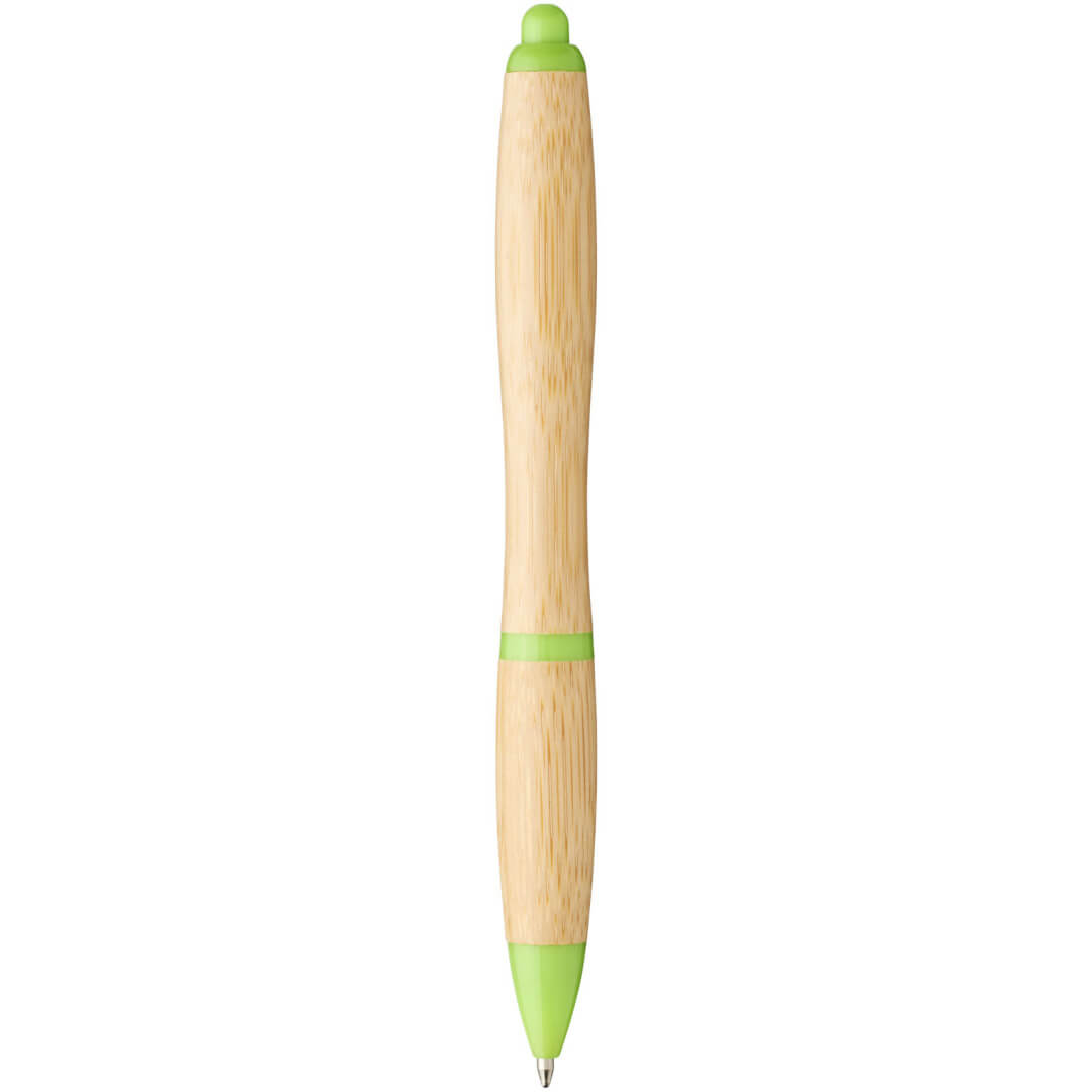Guľôčkové pero Nash z bambusu. Ekologické guľôčkové pero so stláčacím mechanizmom, telom vyrobeným z bambusu, s detailmi z ABS plastu a chrómovou sponou. Farba bambusového materiálu sa môže rôzniť. Bambus, plast ABS.