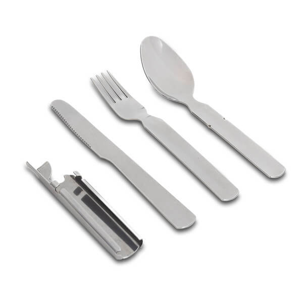 Štvordielna praktická súprava príborov z nehrdzavejúcej ocele v taške. Ideálne na výlety do prírody alebo kempovanie. Sada obsahuje: nôž, vidličku, lyžicu, otvárač na konzervy a otvárač na fľaše. Kompaktný dizajn, v ktorom jednotlivé časti do seba zapadajú na jednoduché skladovanie.
