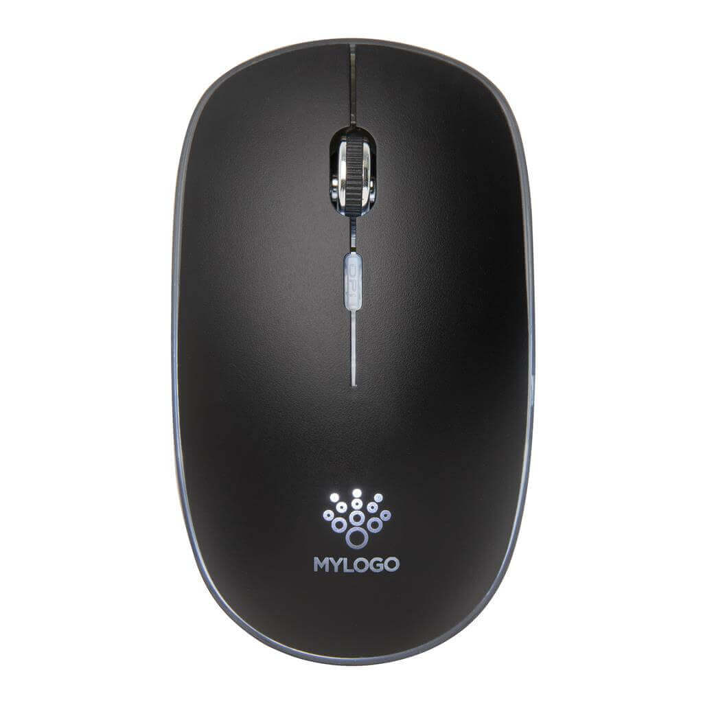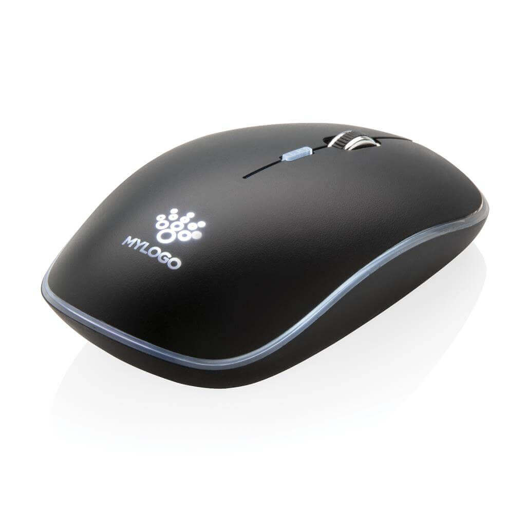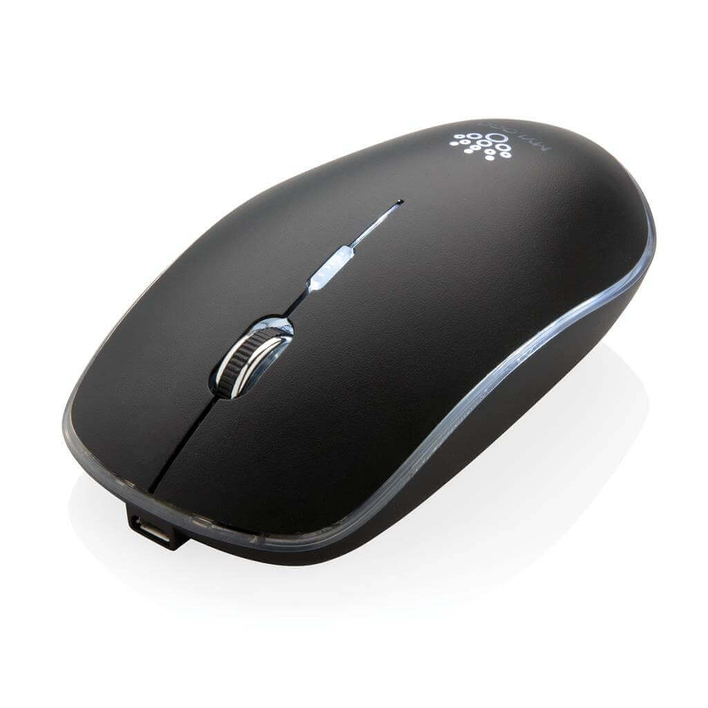 Komfortná bezdrôtová myš s možnosťou gravíru logá, ktorého vzor sa pri používaní rozsvieti a logo tak efektne zvýrazní. Obsahuje dobíjacie 300 mAh lítium polymérovú batériu (plné nabitie za 3 hodiny). Bezdrôtové pripojenie (125 Hz) zabezpečuje USB prijímač, ktorý sa ľahko inštaluje do počítača. Ľavé a pravé klikacie tlačidlá a prostredný klikacie / rolovacie koliesko. Citlivosť myši je možné prispôsobovať. Kompatibilný so všetkými najnovšími operačnými systémami Windows a Mac. 1 batériou typu Li-poly
