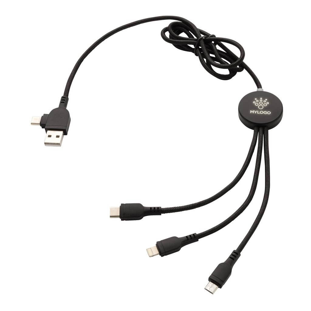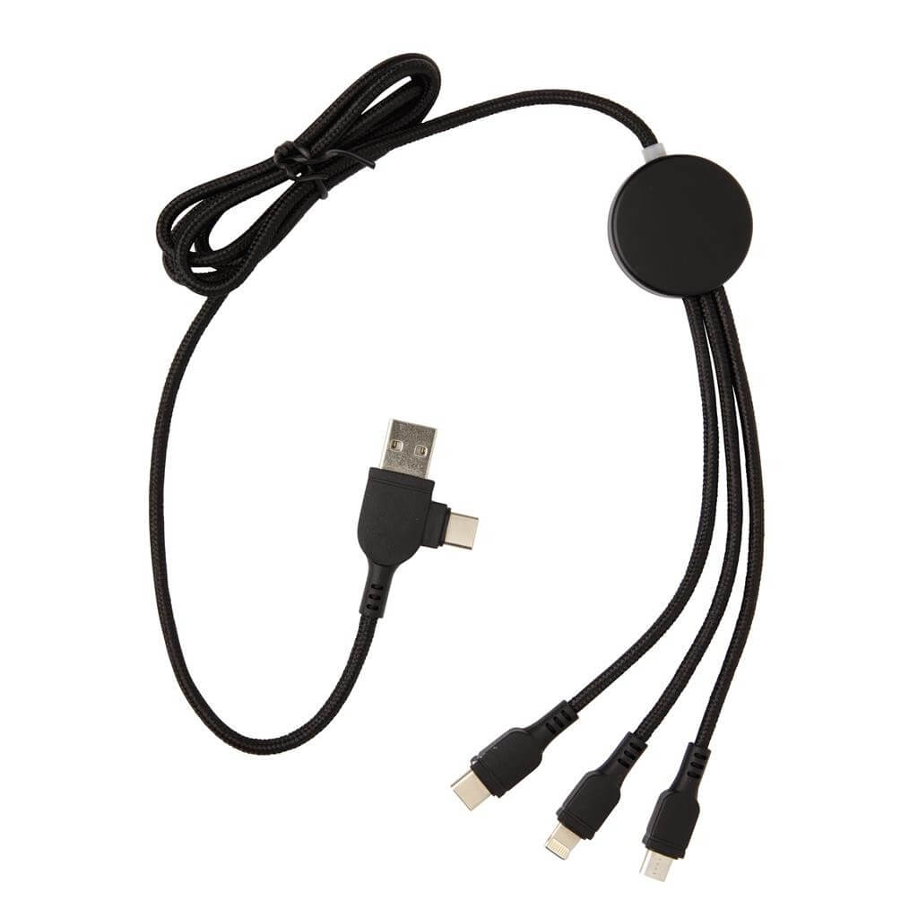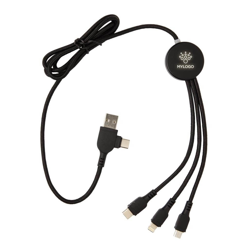 Nylonom opletený univerzálny nabíjací kábel s 5 konektormi: USB C / USB A vstup, USB C / micro USB / iOS výstup. USB C je vhodný pre nabíjanie moderných telefónov, ale aj MacBook. USB A má dvojakú funkciu (vstup aj výstup) pre nabíjanie akéhokoľvek zariadenia z akéhokoľvek iného zdroja. Puzdro vyrobené z ABS s priestorom na gravír loga, ktoré sa pri používaní osvetlí. Bez PVC. Dĺžka: 120 cm.