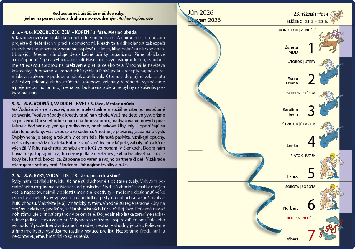 Obľúbený diár s graficky prepracovaným týždenným kalendáriom Vám spríjemní každý týždeň novým mottom spolu s praktickými radami, ktoré sú ovplyvňované fázami Mesiaca. Slovenské texty a kalendárium slovenské , druhý jazyk kalendária je český.