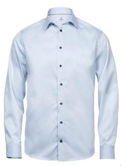 · 133 g / m² · 100% bavlna (keper, zafarbená priadza) · krátky tvar goliera · vystužený golier a manžety · zadné ramenné jarmo · zužujúce švy na chrbte · manžety s 2 gombíkmi · zaoblený lem · povrchová úprava pre ľahké žehlenie · pohodlné nosenie.