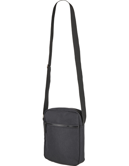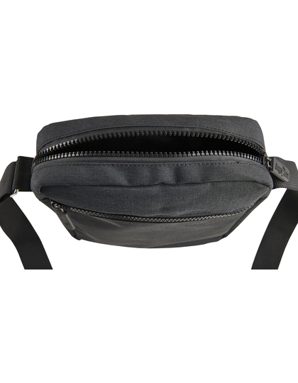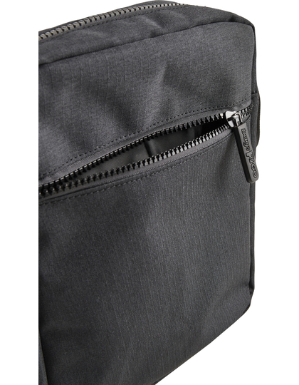 Taška na rameno z ripstopu/PU 600D, čierno melírovaná. Hlavný oddiel. Predné vrecko na zips. Vnútorná priehradka na zips. Čierny opasok s nastaviteľnou dĺžkou a dvoma kovovými očkami. Všetky zipsy sú čierne.