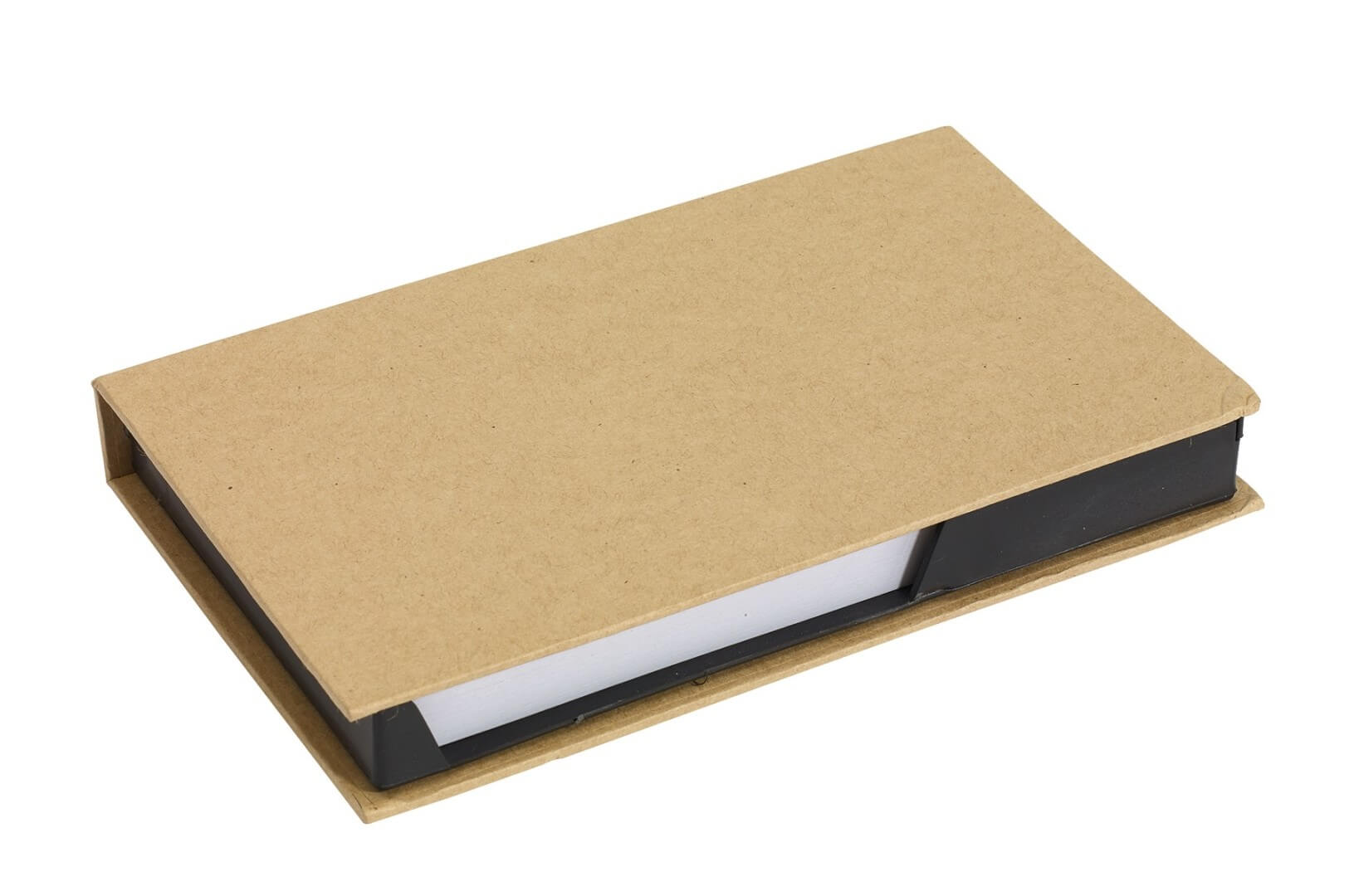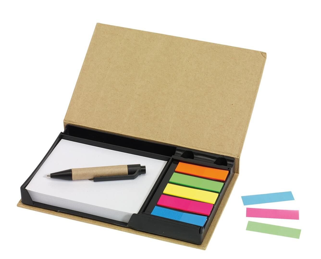 Memo box "Drawer": poznámkový blok so 120 listami,20 kancelárskych spiniek v krytom zásobníku, 5 x 20 rôzne farebných lepiacich papierikov, 1 mini guľôčkové pero (čierny atrament), kryt je vyrobený z recyklovateľného kartónu