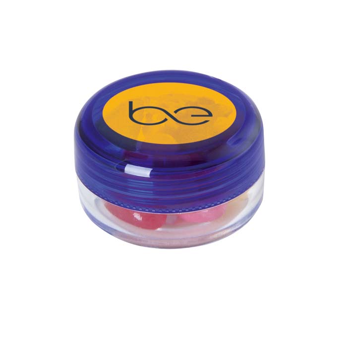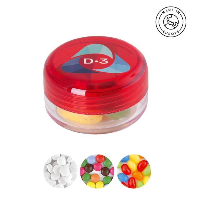 Mentolky a cukríky v okrúhlej plastovej nádobe, vyrobené v Európe.