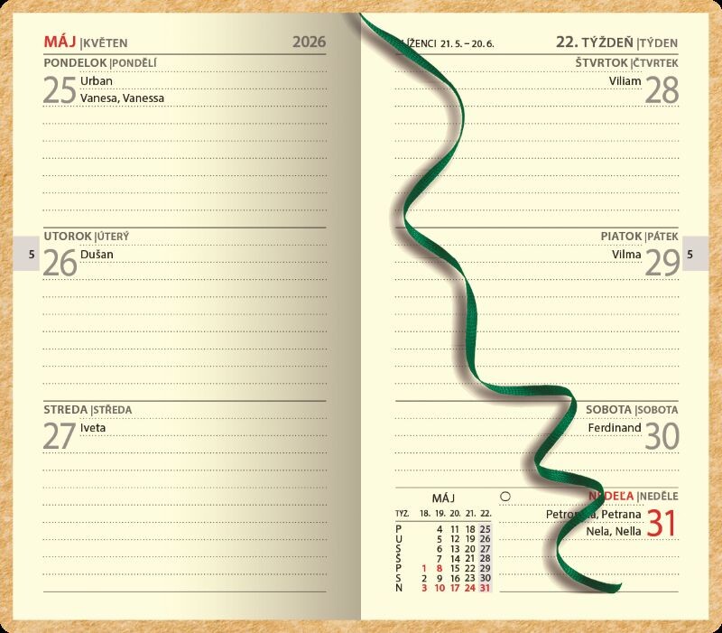 Certifikovaný týždenný mini diár s prehľadným slovenským kalendáriom na každý týždeň. Na obal je použitý vysokokvalitný papier NAPURA s prírodným dizajnom, 100 % recyklovateľný, s lacetkou. Vďaka vysokej kvalite vlákien je možná: termorazba, razba fóliou alebo UV tlač.