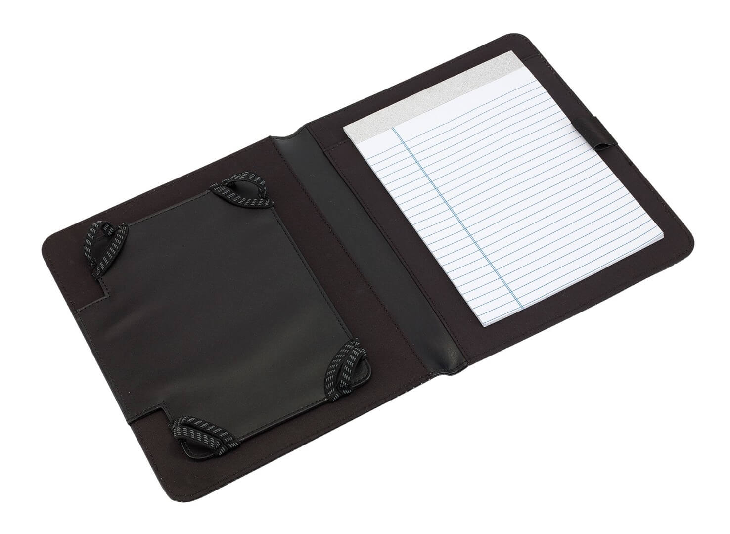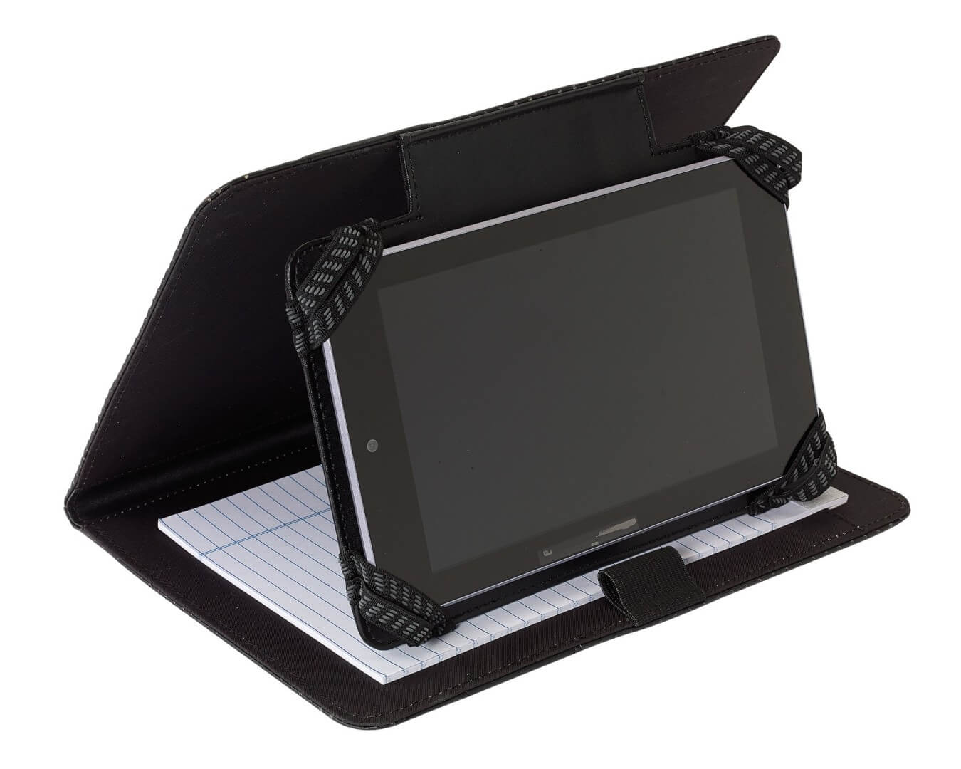 Dosky na Mini tablet "Hill Dale", rozmer A5: držiak na tablet s elastickými fixačnými pásmi, vhodné pre 7-palcové tablety a iPad mini; obsahuje linajkový poznámkový blok a pútko na pero, na vonkajšej strane dierovaný dizajn, s kovovým plátkom pre vaše logo