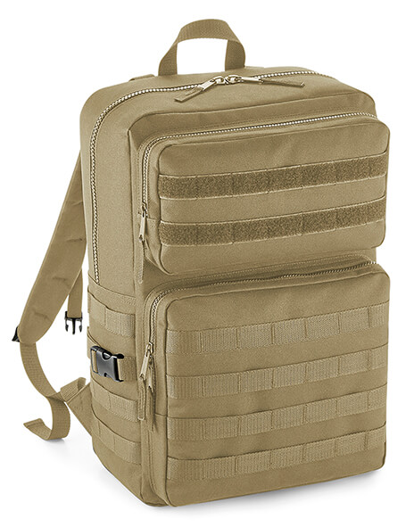 ·100% polyester (600D) ·inšpirovaný vojenským štýlom ·Kompresné ramienka a rukoväť ·polstrované nastaviteľné rukoväte ·polstrovaný zadný panel ·MOLLE detailz ·hlavný priestor a vnútorné vrecko na zips ·2 veľké predné vrecká na zips ·odtrhnuteľný štítok ·možno kombinovať s produktom MOLLE BG840 (955.29) ·možno kombinovať s produktami Modulr ™ Multipockets BG241 (934.29) a BG242 (935.29) ·objem: 25 litrov ·rozmery: 30 x 45 x 22 cm ·max. výšivka: priemer rámčeku 9 cm ·max. plocha tlače: 9 x 6 cm