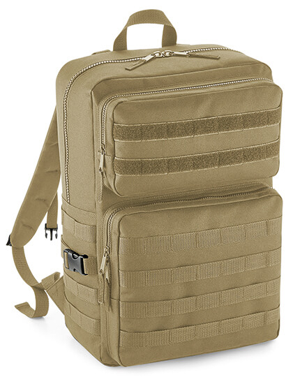 600D polyester. Tearaway Label. Popruh Dual Rip-Strip ™ MOLLE. Detail slučky popruhu Molle. Dve veľké predné vrecká na zips. Hlavná komora na zips. Vnútorné protišmykové vrecko. Uchopte rukoväť. Polstrovaný zadný panel. Kompresné pásky. Polstrované