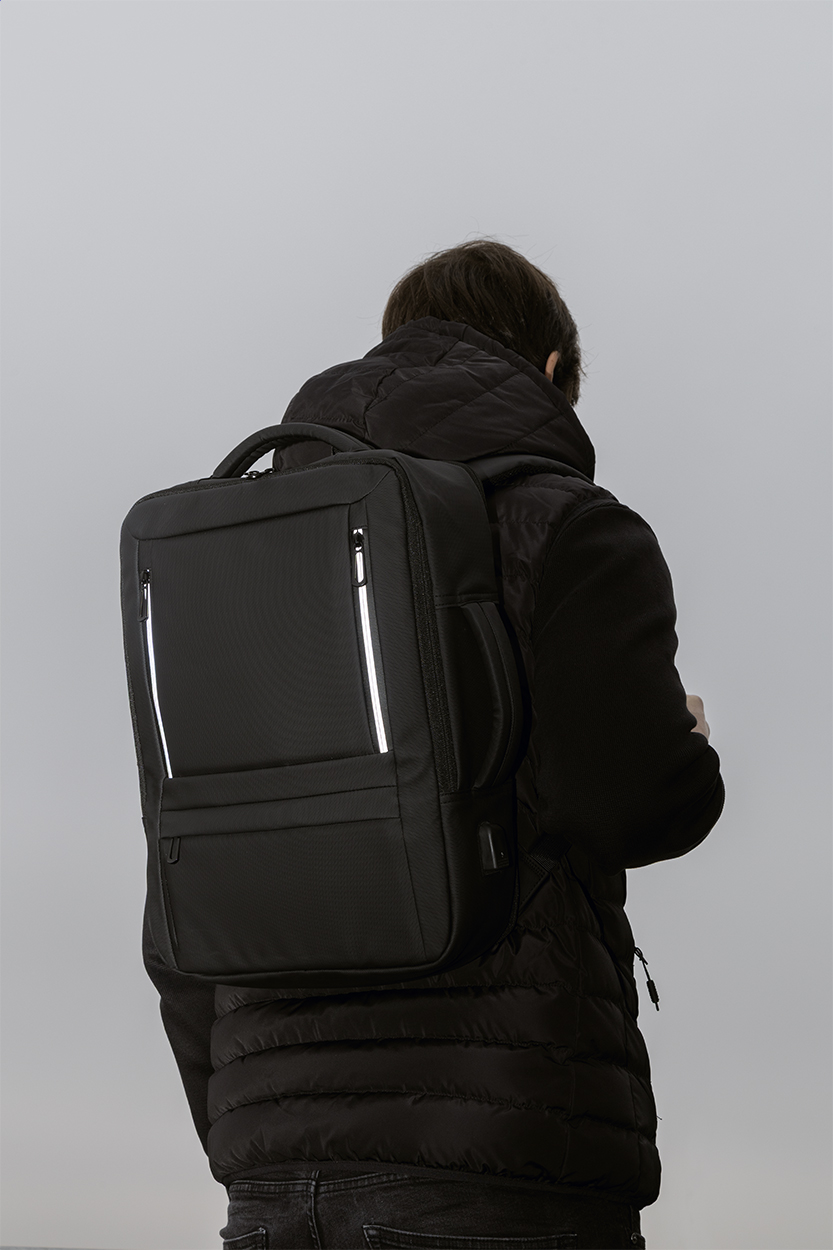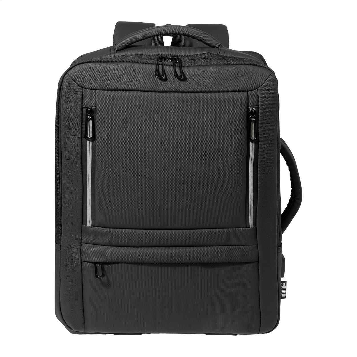 Outdoorový batoh z RPET s priehradkami na zips a predným vreckom, polstrovanou priehradkou na notebook (15"), sieťovanými bočnými vreckami a elastickými šnúrkami vpredu. S polstrovaným chrbtom a ramennými popruhmi. Polyester 600D RPET s výrazným štítkom RP. New. Go Green. Nosnosť tašky: 10 kg. Objem tašky: 22 l
